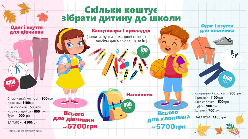 Загалом, щоб зібрати учня та ученицю до школи, згідно з підрахунками Терену, потрібно в середньому 5700 грн. Тоді як минулого року можна було вкластися у 4500 грн. Нагадаємо, 18 серпня уряд запустив державну програму «Пакунок школяра». Тепер батьки та законні представники першокласників отримають одноразову допомогу в розмірі 5 тисяч гривень через застосунок «Дія».