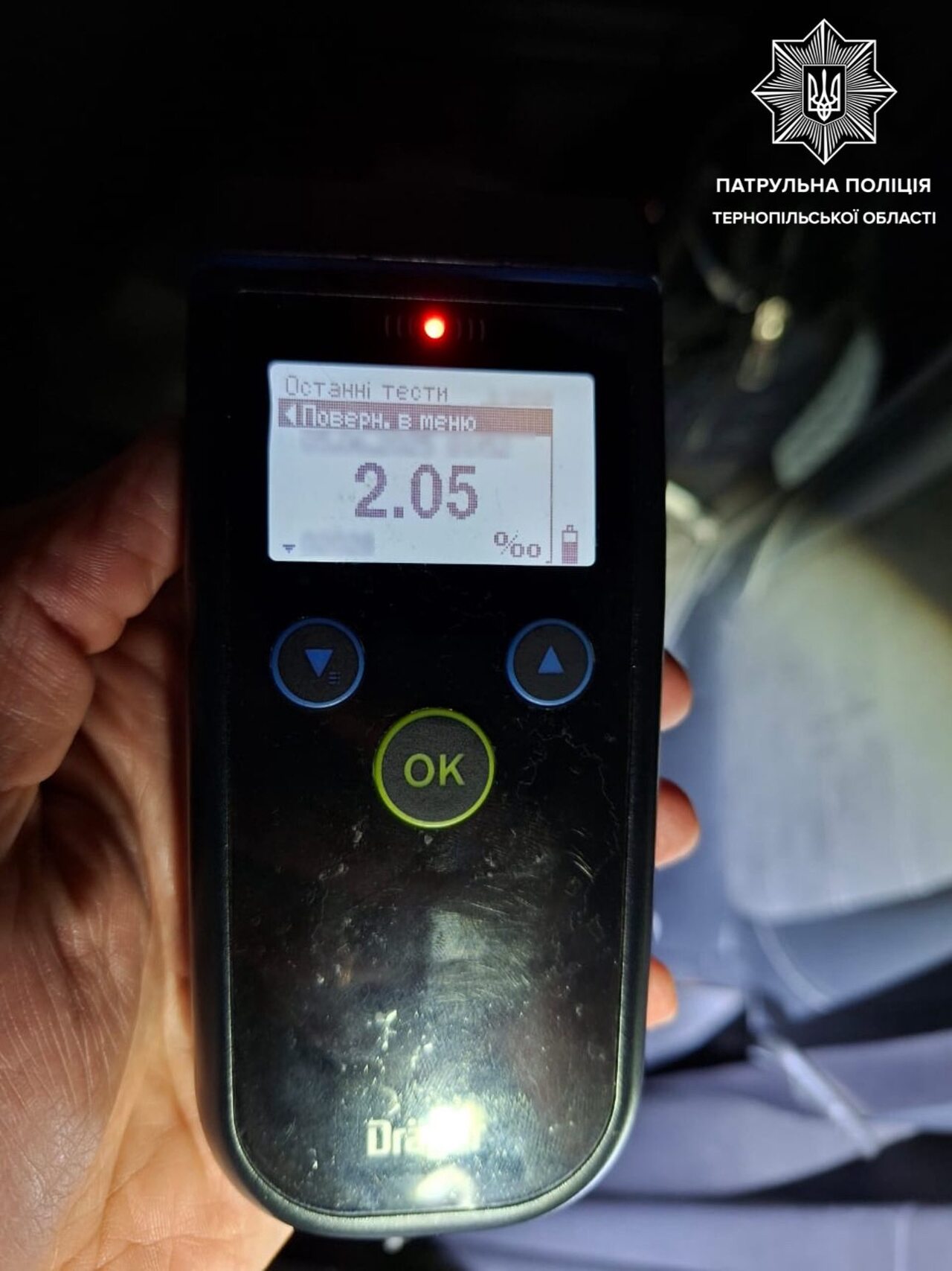 Спілкуючись з водійкою інспектори виявили в неї ознаки алкогольного сп’яніння. Жінка погодила пройти відповідний огляд на місці за допомогою приладу Драгер. Результат — 2,05 проміле.