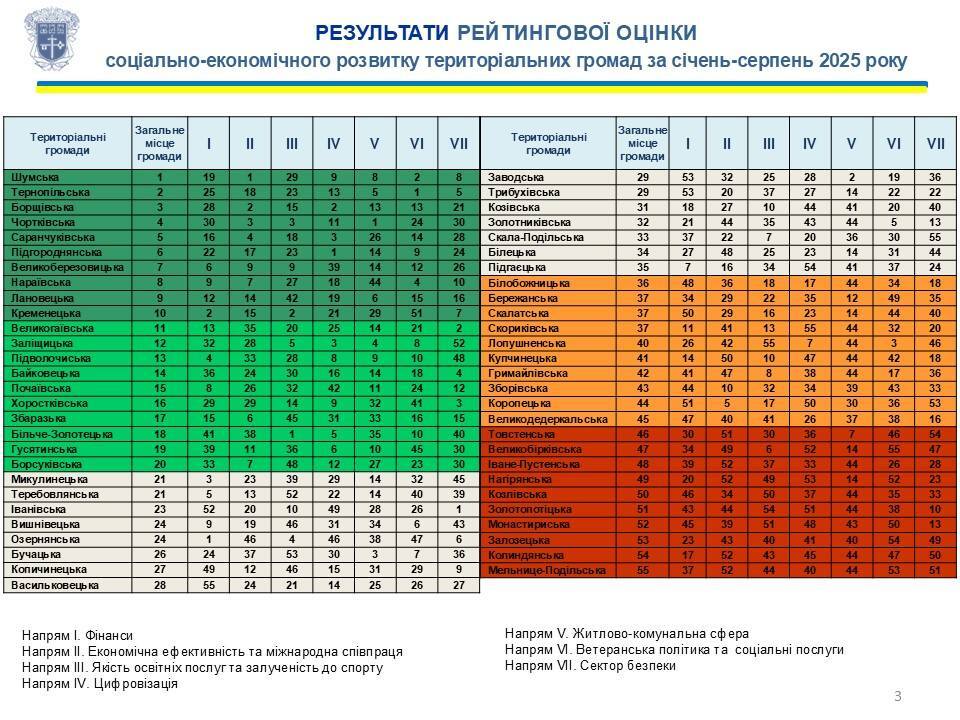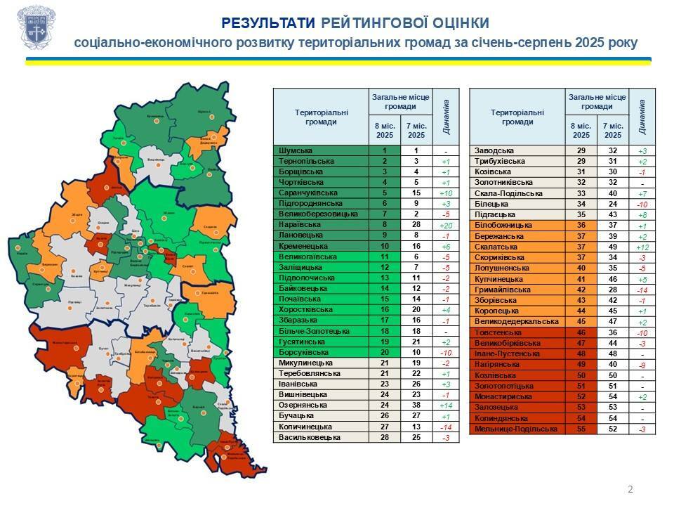 Рейтинг показників соціально-економічного розвитку громад за 8 місяців 2025 року оприлюднили у пресслужбі Тернопільської обласної військової адміністрації.