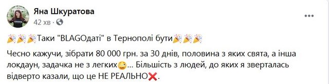У дописі Яни Шкуратової (її у Тернополі знають як керівницю благодійної крамниці «Одежина», а також волонтерку, яка давно допомагає переселенцям і людям, що опинилися у скруті в зоні зіткнення на сході України – прим.) йдеться (цитуємо): «…Чесно кажучи, зібрати 80 000 грн за 30 днів, половина із яких - свята, а решта - локдаун, завдання не з легких… Більшість людей, до яких я зверталася відверто казали, що це не реально. Але віра в перемогу та палке бажання створити у Тернополі простір для розвитку благодійності, не давали зупинитися та опустити руки. Тому сьогодні я безмежно дякую усім Вам за добрі слова, час, енергію і гроші, яких ви не шкодували задля підтримки проєкту Благодійний магазин "BLAGOдать».