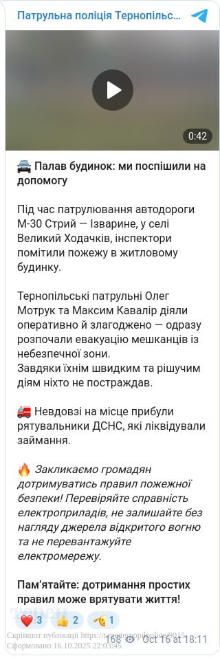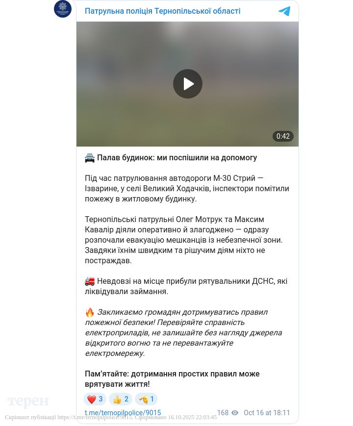 У селі Великий Ходачків тернопільські патрульні врятували мешканців із палаючого будинку. Пожежу помітили під час патрулювання автодороги М-30 Стрий — Ізварине. Інспектори діяли швидко та злагоджено — одразу розпочали евакуацію людей із небезпечної зони. Про це повідомили у пресслужбі Патрульної поліції Тернопільщини.