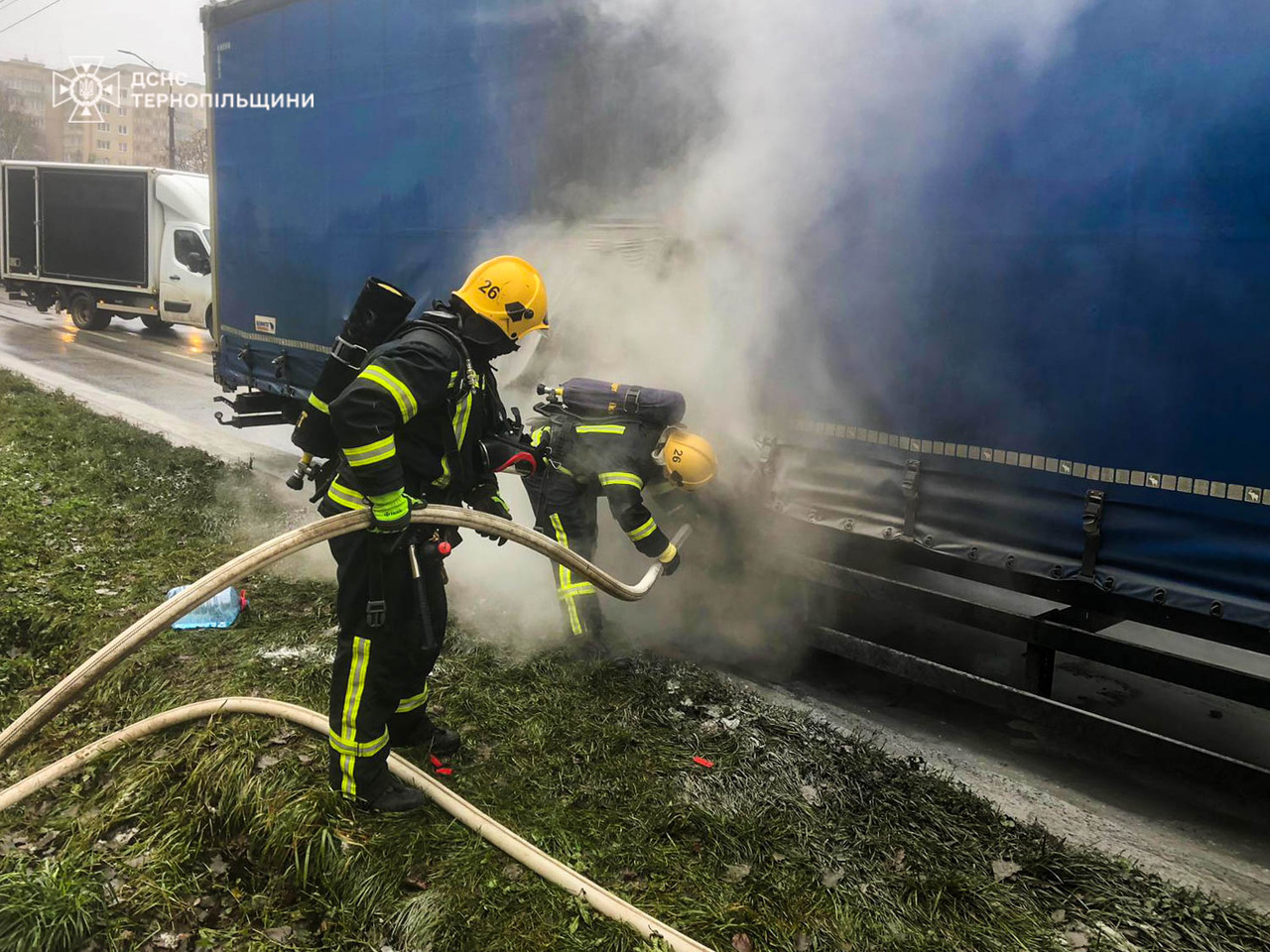 Нагадаємо, 23 листопада, об 11:08 у Тернополі на вулиці 15 Квітня виникла пожежа причепа вантажного автомобіля. Завдяки оперативним діям бійців ДСНС недопущено перекидання вогню на дві одиниці техніки, що знаходились поруч.