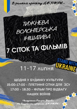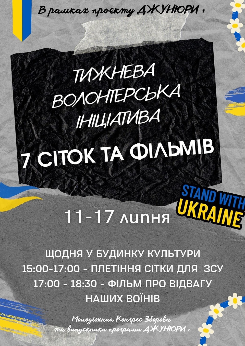 Тиждень плетіння сіток і перегляду фільмів про українських військових анонсував Молодіжний конгрес Зборова. Так, молодь щодня з 11 по 17 липня збиратиметься у місцевому Будинку культури, щоб плести маскувальні сітки для ЗСУ.