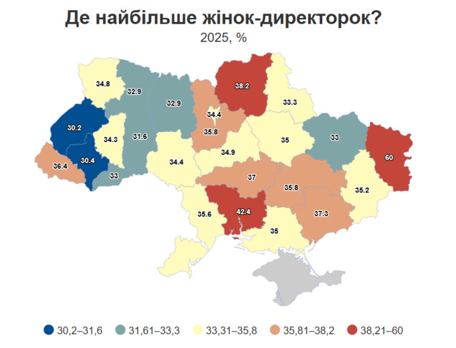 Водночас у низці регіонів частка жінок-директорок дещо нижча. Зокрема, у Львівській та Івано-Франківській областях вона становить по 30%, у Хмельницькій — 32%, а у Житомирській та Рівненській — по 33%.