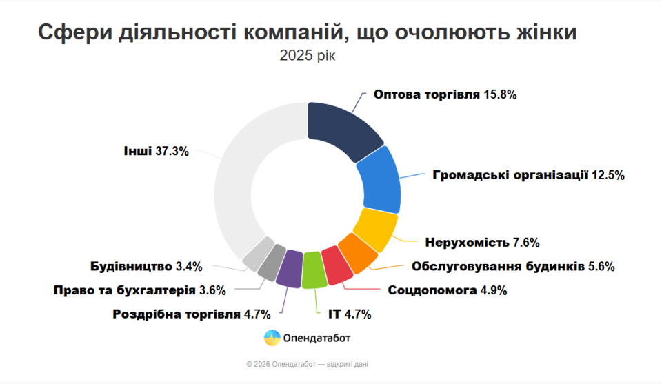 Найчастіше жінки очолюють компанії у сфері оптової торгівлі. У 2025 році в цій галузі з’явилося 5 429 нових бізнесів під керівництвом жінок, що становить близько 15% від загальної кількості. Також серед популярних напрямків — діяльність громадських організацій, операції з нерухомістю, ІТ та будівництво.