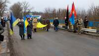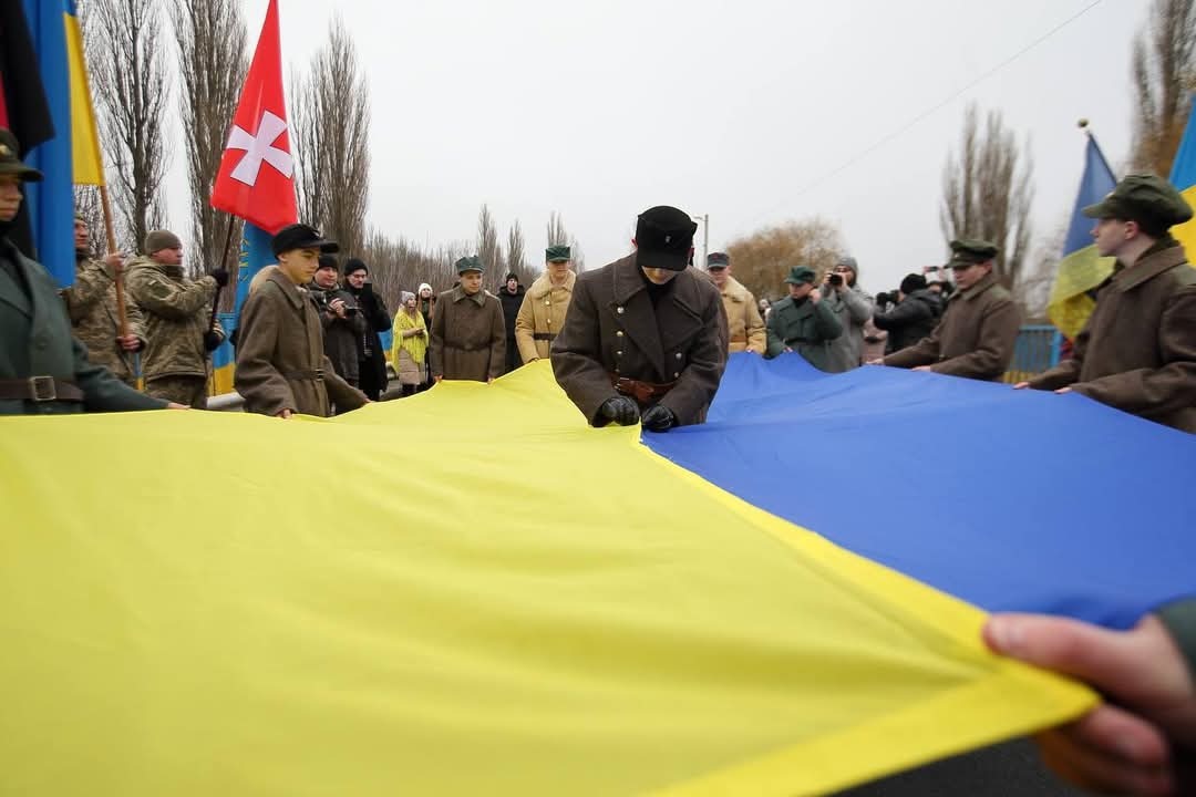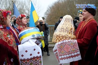 На мості через річку Збруч зустрілися представники двох областей, щоб продемонструвати нашу єдність. Вони поєднали частини синьо-жовтого прапора і символічно обмінятися короваями