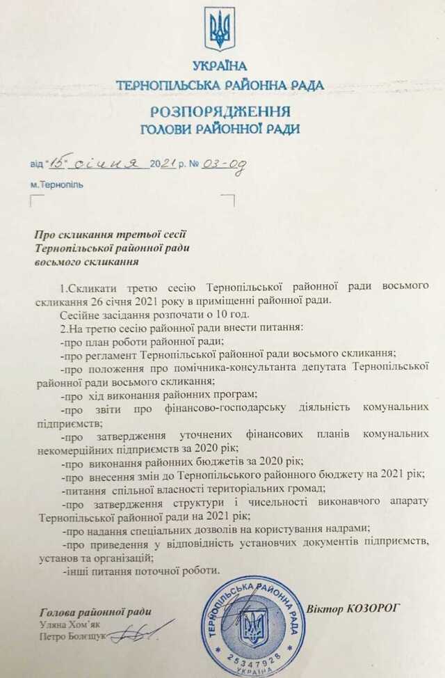 Сесія Тернопільської районної ради 8-го скликання відбудеться завтра, 26 січня. За розпорядженням голови органу місцевого самоврядування Віктора Козорога, депутати мають зібратися о 10-й годині в приміщенні залу засідань, що у Тернополі, на майдані Перемоги, 1.