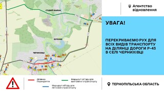 На Тернопільщині повністю перекрили рух транспорту на ділянці дороги Р-43 у селі Чернихівці через ремонт мосту, пошкодженого раніше вантажівкою. Про це повідомили у Службі відновлення та розвитку інфраструктури у Тернопільській області.