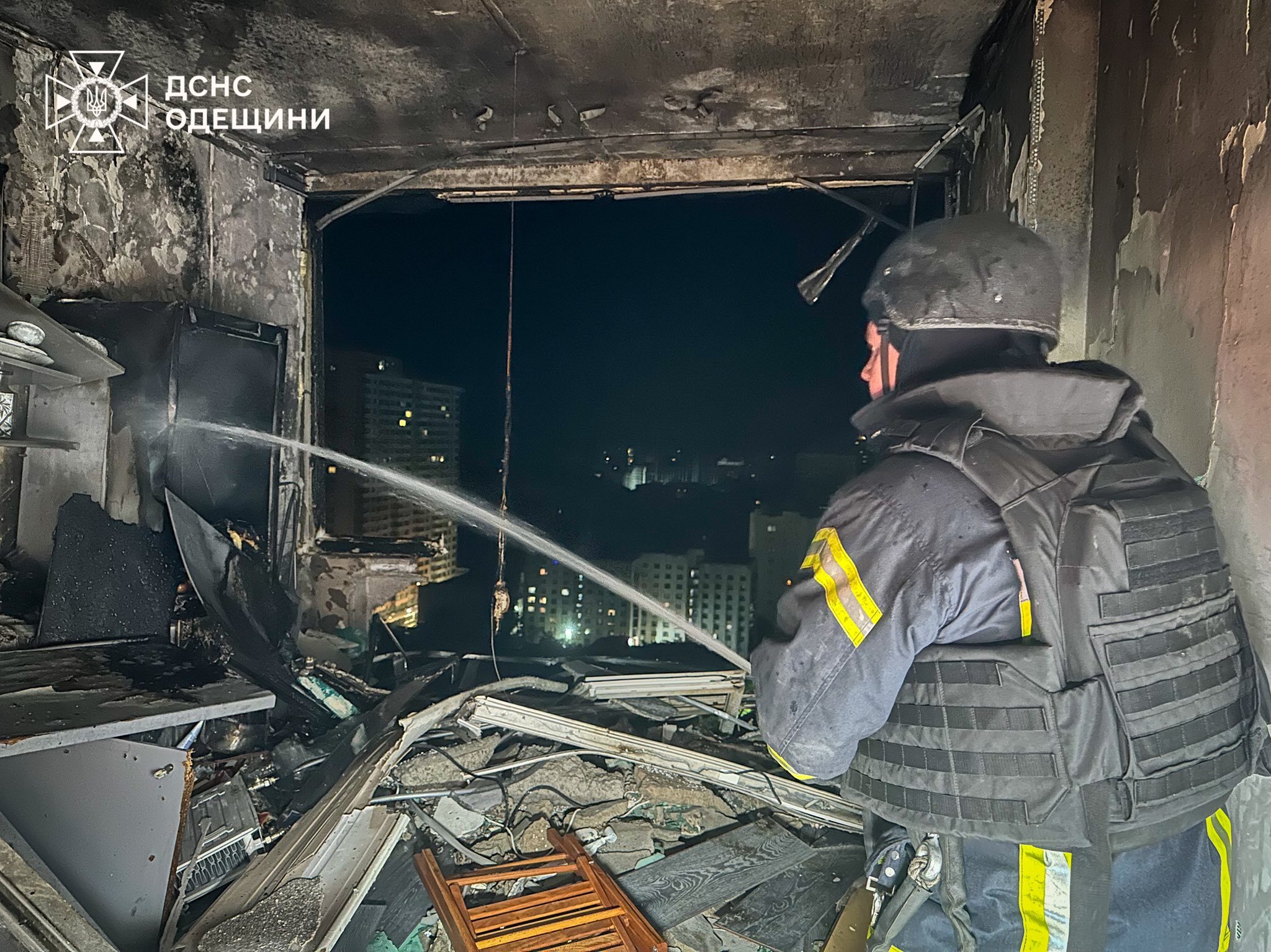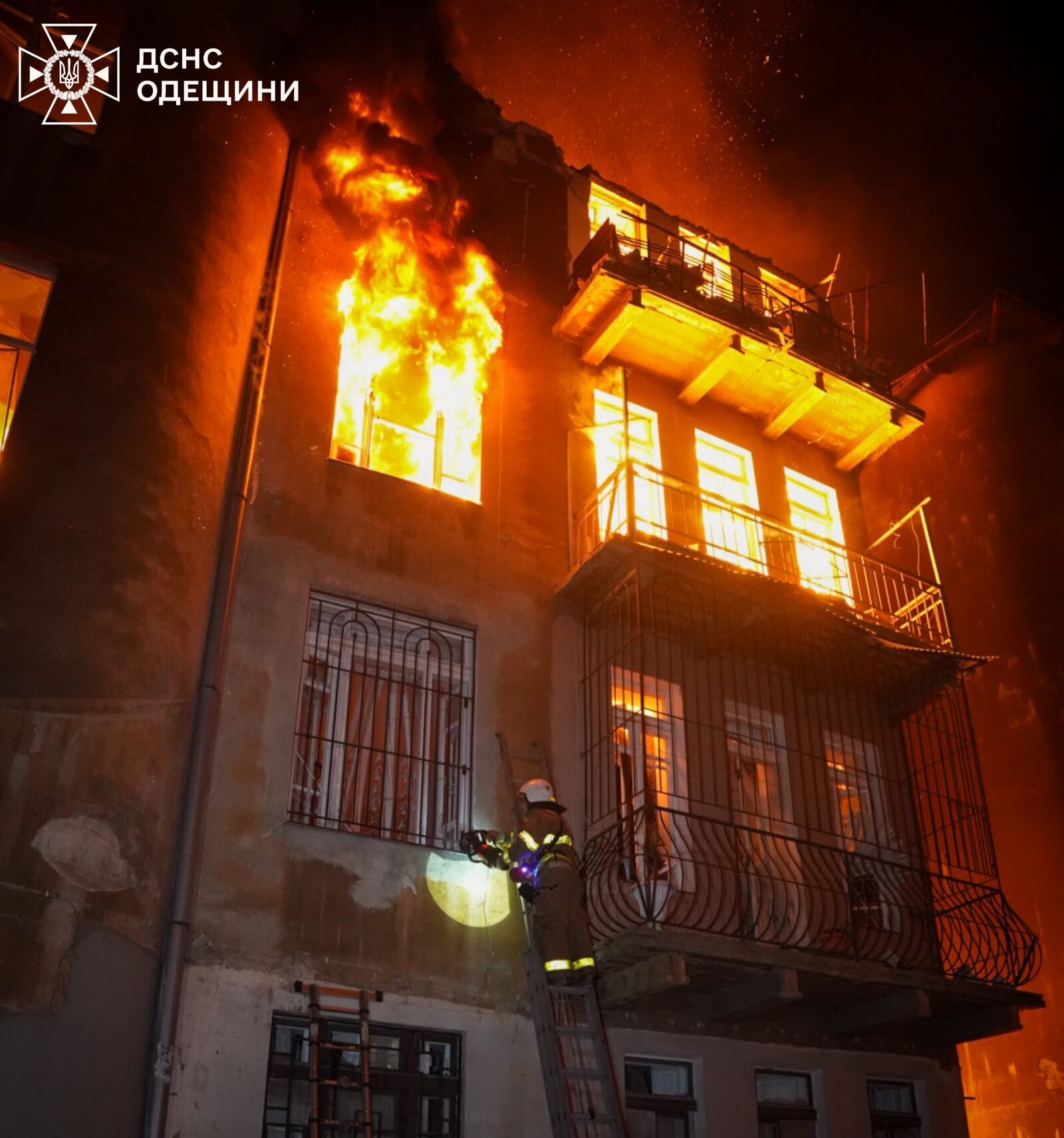 В Одесі цієї ночі, 20 червня, понад 10 місць влучань, масштабні пожежі. Вогнем повністю охопило 4-поверховий житловий будинок. Вогнеборці врятували 3 осіб, ще 6 евакуювали з палаючої будівлі. Про це повідомили у пресслужбі ДСНС України в Одеській області.