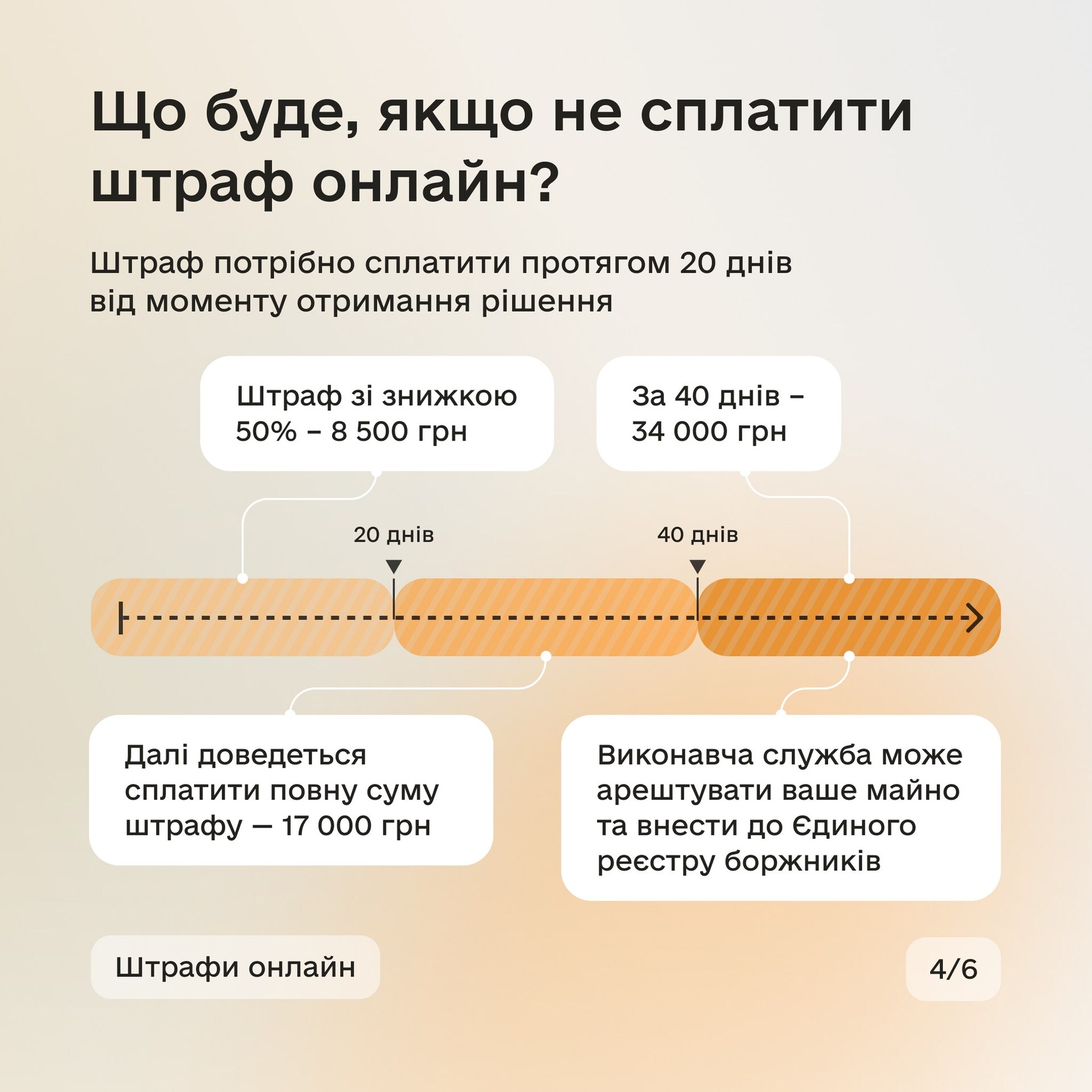 Як було сказано вище, у людини є 20 днів, щоб оплатити штраф зі знижкою в 50%. Якщо не зробити це вчасно, то сума подвоїться до 17 000 грн. Якщо оплати не буде ще 20 днів, то сума становитиме 34 000 грн. Справу передадуть до виконавчої служби, яка може заблокувати банківські рахунки, арештувати майно або транспорт та внести людину до Єдиного реєстру боржників.