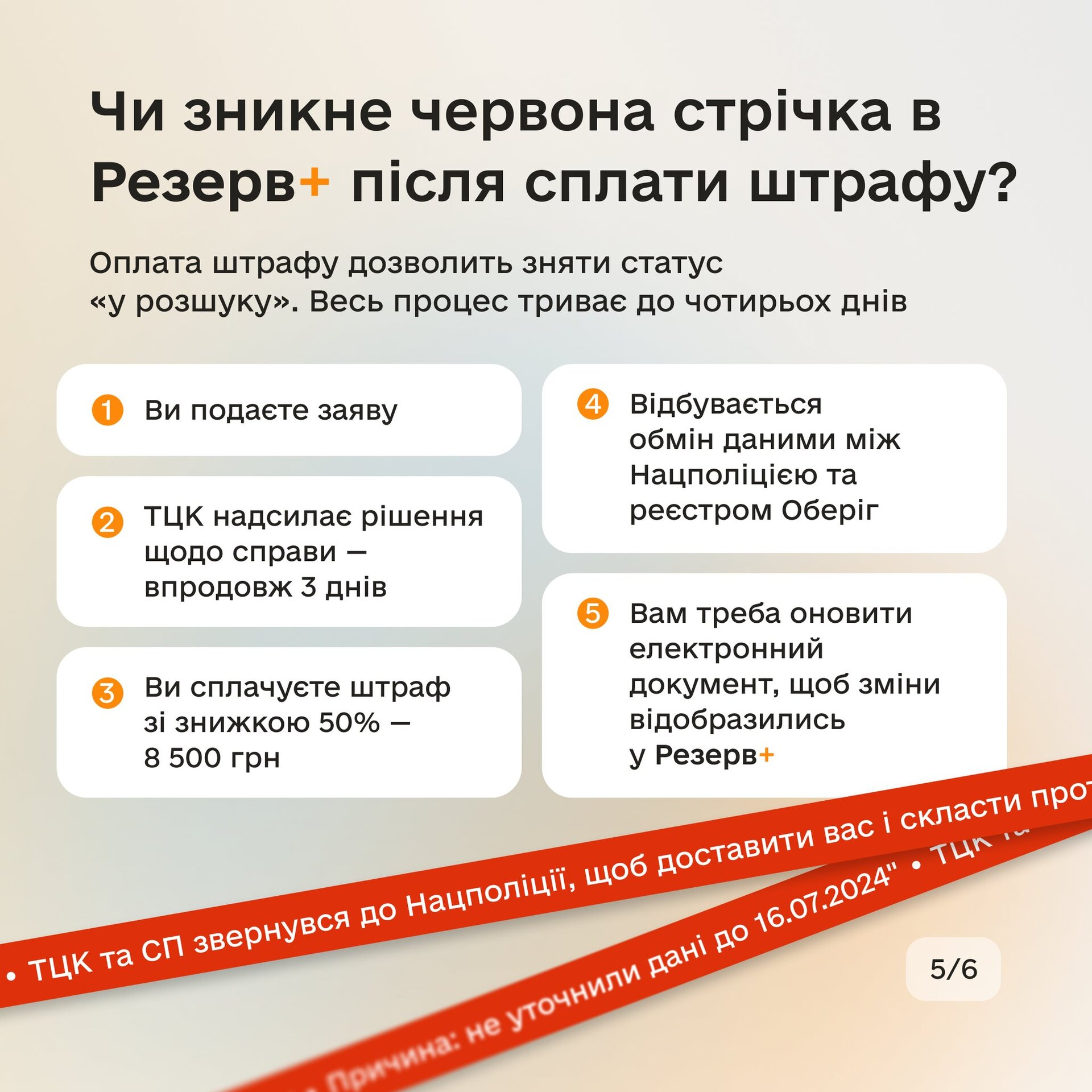 Сплата штрафу не скасовує обов’язок виконати вимоги військового обліку. Вона закриває одне порушення і прибирає червону стрічку. Але якщо ви, наприклад, отримаєте повістку і не з’явитеся за нею, то стрічка знову з’явиться в Резерв+.