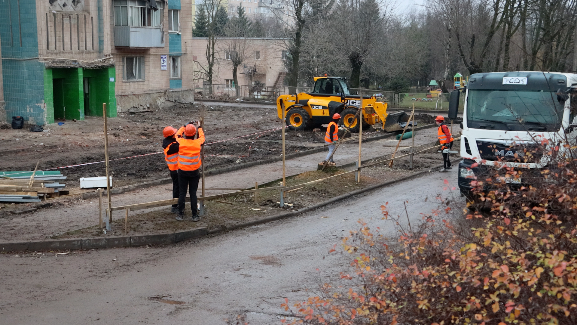 Так, будинок на вул. Стуса, 8, який підлягає знесенню, якраз обгороджували. Один з працівників повідомив, що наступного тижня будівлю планують демонтувати. Також на цьому місці розпочали роботи зі встановлення монументального хреста, наразі там техніка вирівнює територію. А іграшки, квіти, лампадки, які люди приносили на місце трагедії, перенесли трохи далі.