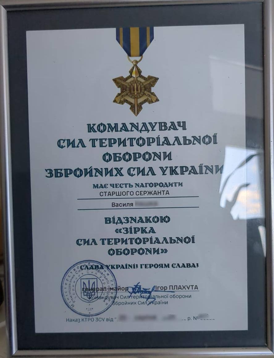 Головний сержант стрілецької роти другого батальйону 105-ї окремої бригади ТрО ЗСУ Василь — один із тих, хто без військової підготовки, але з твердим переконанням, став на захист України у перші дні повномасштабної війни. За мужність і відданість він отримав відзнаку командувача Сил територіальної оборони ЗСУ «Зірка сил ТрО» — нагороду, якою відзначають військовослужбовців за видатні заслуги, ініціативність і професіоналізм. Про це повідомили на фейсбук-сторінці бригади.