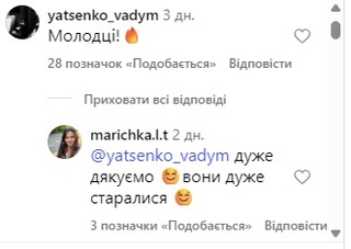 Керівник славнозвісного хору «Гомін» Вадим Яценко похвалив у коментарях в інстаграмі спів тернопільських школярів. Відео виступу опублікувала на своїй сторінці Марія Луців.