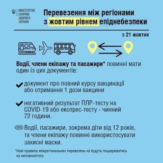 Отже, для користування міжрегіональним транспортом у регіонах із «жовтим» та «червоним» рівнем епіднебезпеки потрібно буде мати один із вказаних документів: - оформлений на порталі «Дія» або в однойменному додатку «жовтий» чи «зелений» міжнародний чи внутрішній COVID-сертифікат на підставі отримання однієї дози вакцини або повного курсу вакцинації; - іноземний COVID-сертифікат про щеплення вакцинами, які включені ВООЗ до переліку дозволених для використання в надзвичайних ситуаціях; - документ про отримання однієї дози вакцини – форма 063-О, яку можна отримати одразу після процедури у лікаря, який проводив щеплення; - міжнародне свідоцтво про вакцинацію, яке буде чинним рік від дати останнього щеплення (його можна оформити у лікаря, який проводив щеплення в пункті щеплення закладу охорони здоров'я, або в сімейного лікаря); - негативний результат ПЛР-тесту або експрес-тесту на COVID-19, чинні 72 години від часу здавання матеріалу на аналіз.