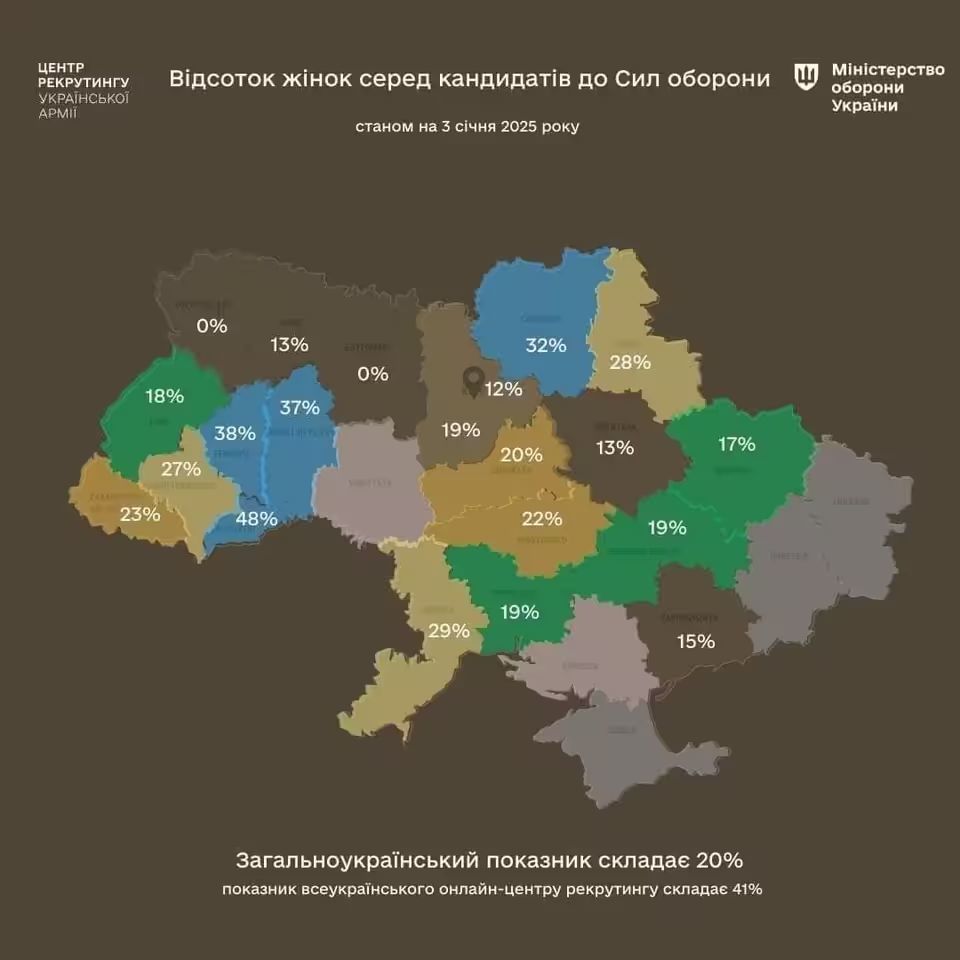 Кількість жінок, які бажають долучитися до Сил оборони через центри рекрутингу української армії зростає. Станом на 3 січня 2025 року 20% від всіх кандидатів - це жінки, - зазначили в Центрі рекрутингу.