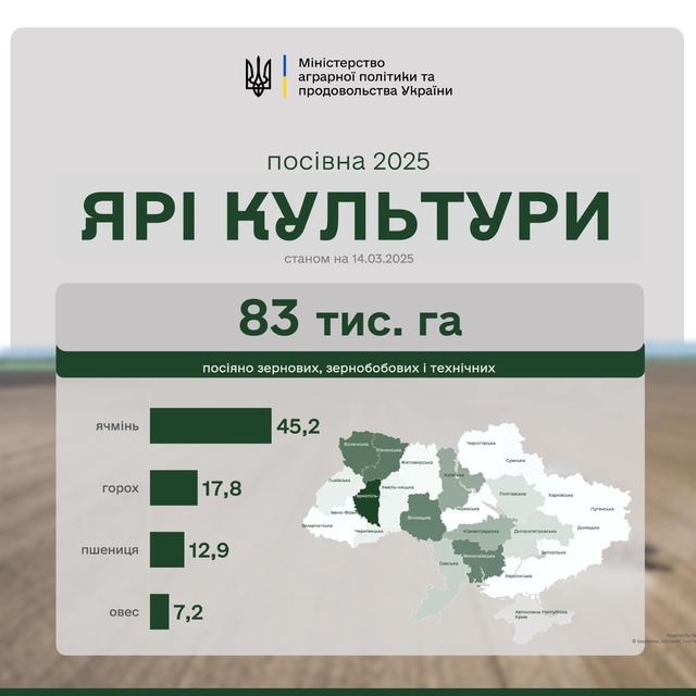 Станом на 13 березня 2025 року аграрії 15 областей України активно засіяли 83 тис. га ярих зернових та зернобобових культур. Про це повідомили у пресслужбі Тернопільської обласної військової адміністрації.