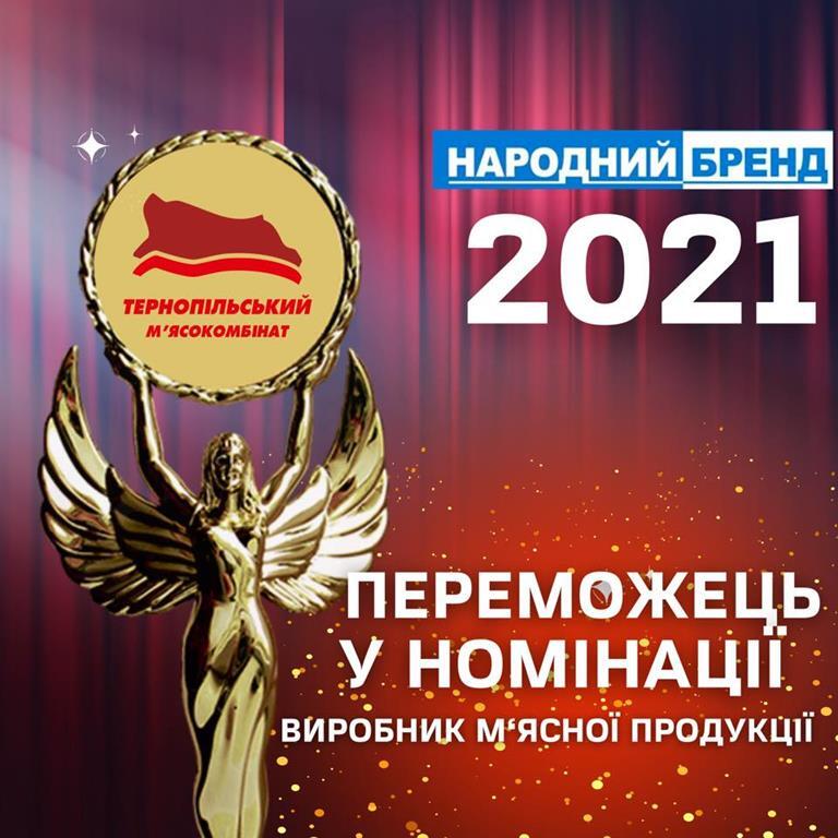 Тернопільський м’ясокомбінат отримав відзнаку «Народний бренд-2021». В конкурсі на визнання найкращих компаній, який RIA Media проводить 20 років поспіль, підприємство здобуло перемогу у номінації «Виробник м’ясної продукції».