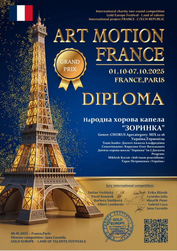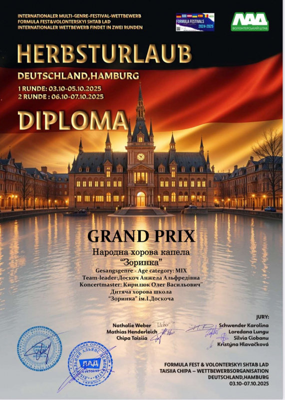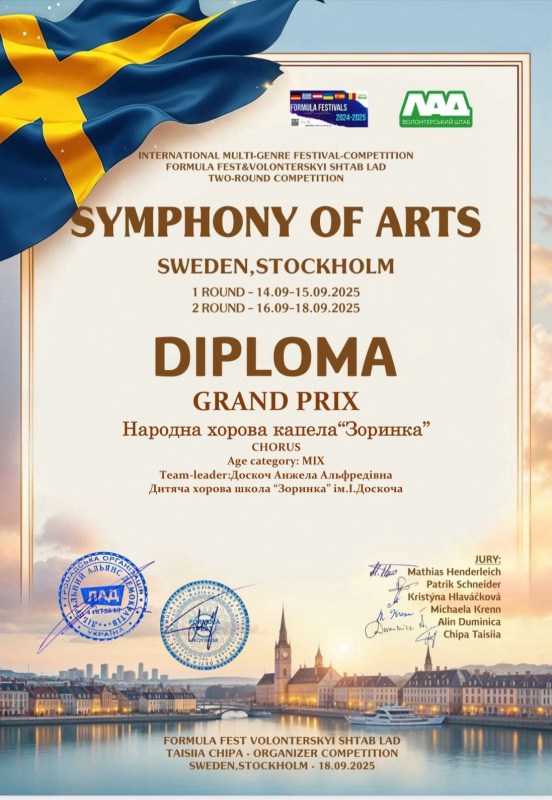 Народна хорова капела «Зоринка» завершила серію виступів за кордоном, здобувши одразу чотири престижні нагороди на міжнародних конкурсах у Швеції, Німеччині, Франції та Південній Кореї. Про це повідомили на сайті Тернопільської міської ради.