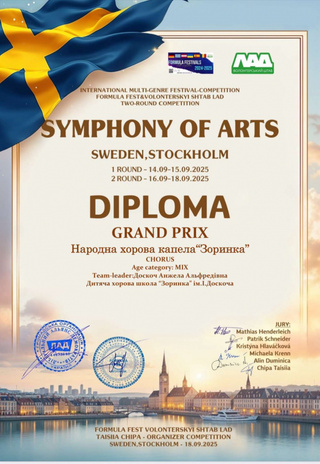 - гран-прі на Міжнародному мультижанровому фестивалі-конкурсі «SYMPHONY OF ARTS» у Стокгольмі (Швеція);