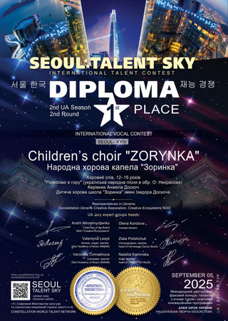 - 1 місце на Міжнародному вокальному конкурсі «SEOUL TALENT SKY» (Сеул-Київ) у номінації «Хоровий спів» (вікова категорія 12-16 років).