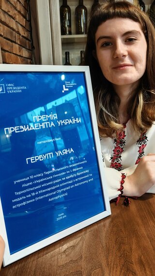 Випускниця Тернопільського академічного ліцею «Українська гімназія» імені Івана Франка 2025 року Уляна Гербут отримала сертифікат на здобуття премії Президента України. Про це повідомили у пресслужбі міської ради.