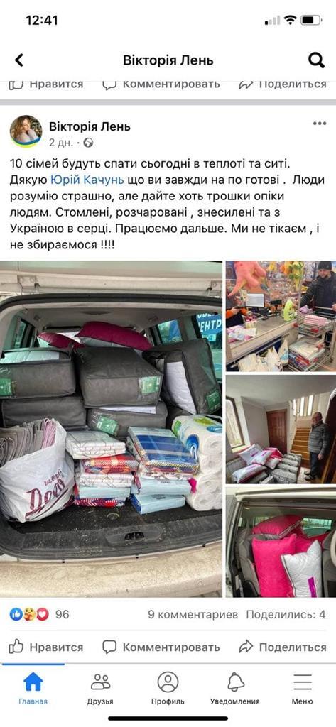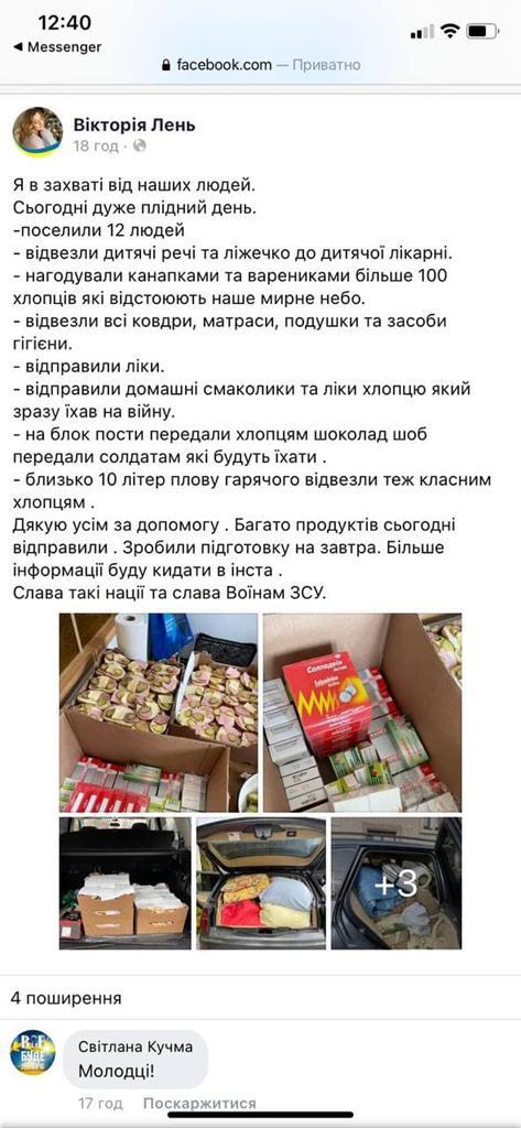 - Я в захваті від наших людей. Сьогодні дуже плідний день. Поселили 12 людей. Відвезли дитячі речі та ліжечко до дитячої лікарні. Нагодували канапками та варениками понад 100 хлопців, які відстоюють наше мирне небо. Відвезли всі ковдри, матраци, подушки та засоби гігієни. Відправили ліки.Відправили домашні смаколики та ліки хлопцю, який зразу їхав на війну. На блок-пости передали хлопцям шоколад, щоб передали солдатам, які будуть їхати. Близько 10 літрів гарячого плову відвезли теж класним хлопцям. Дякую усім за допомогу! - перелічує волонтерка зроблене лише за один день. - Слава такій нації та слава Воїнам ЗСУ.