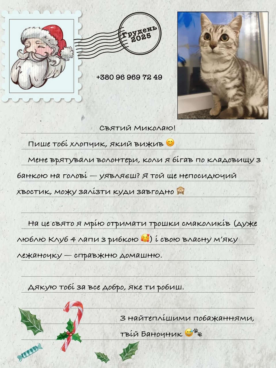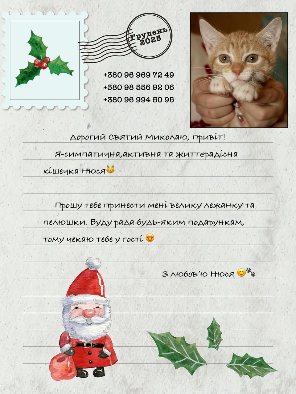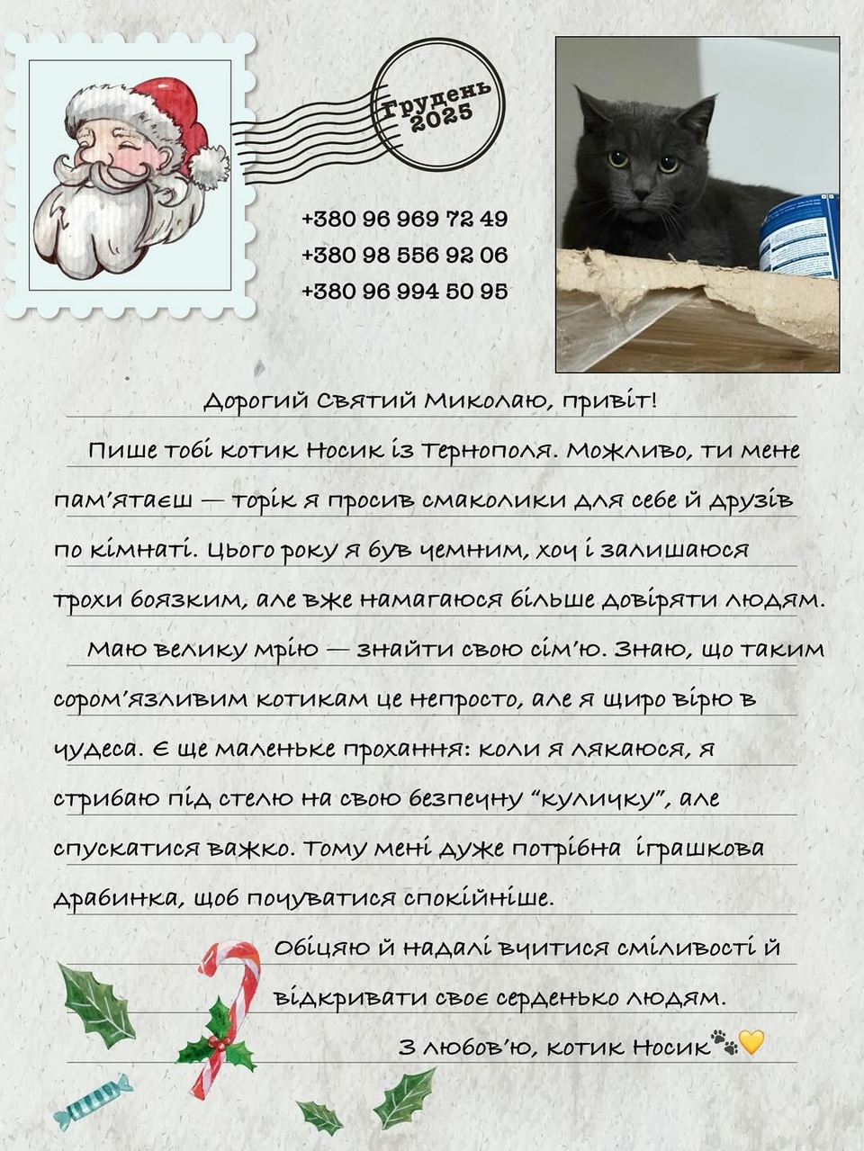 Листи до Миколая від імені котиків поширюють у соцмережах. Таким чином волонтери громадської організації “Ноїв Ковчег” напередодні свята намагаються привернути увагу до безпритульних тварин та просять для них подарунків.