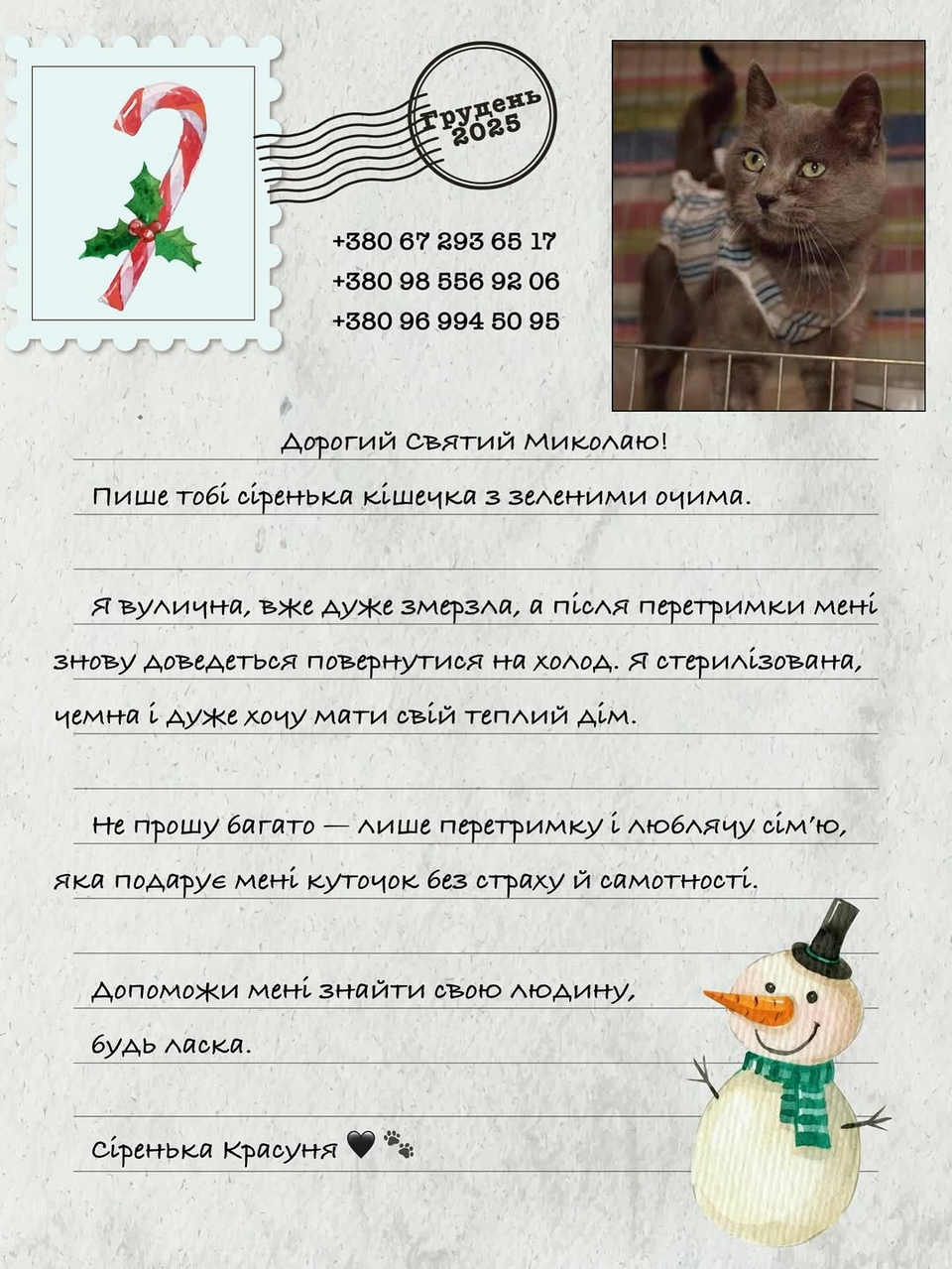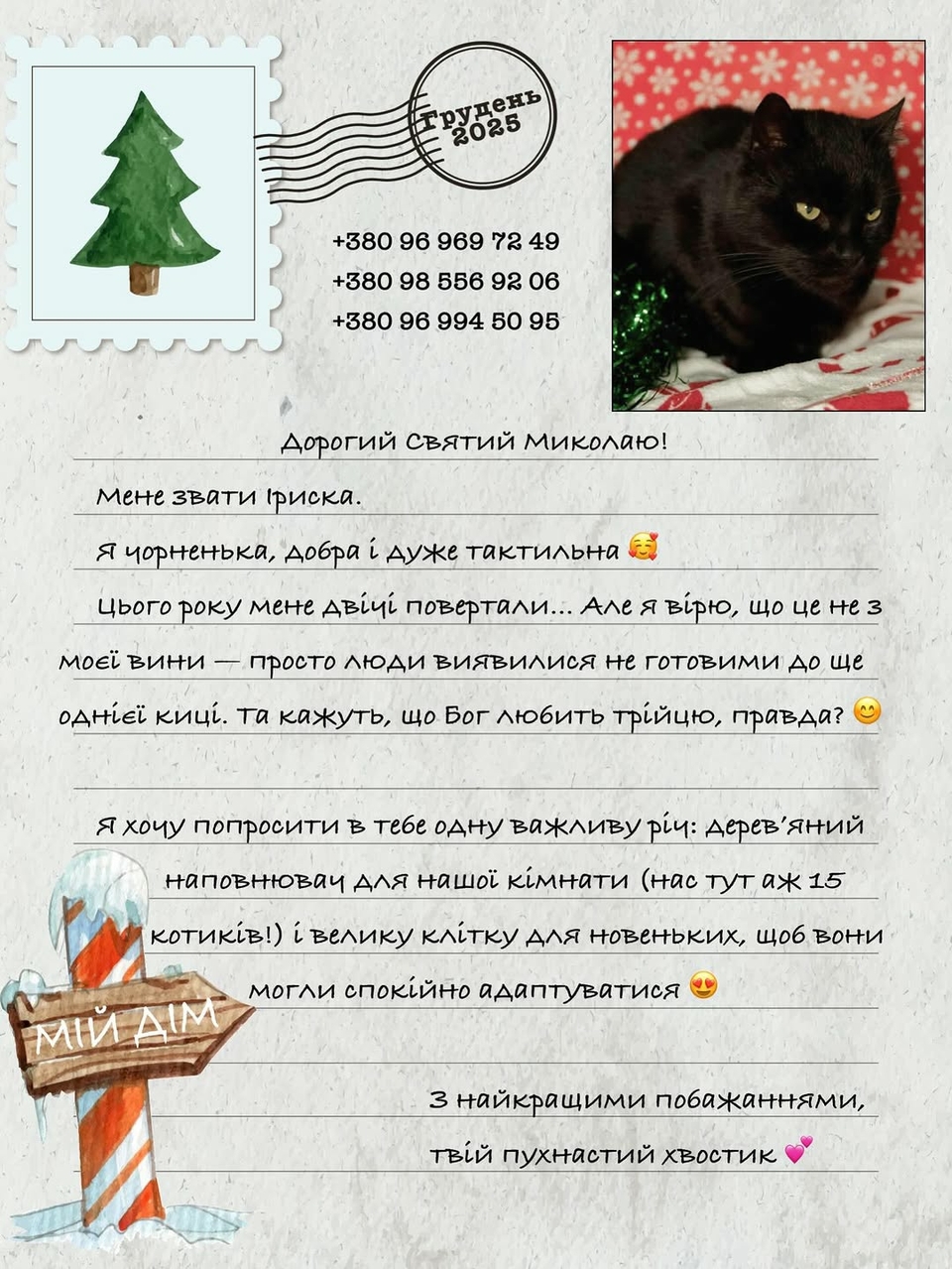 “Миколаю, це котячі сердечка пишуть тобі. Подбай, будь ласка, про всіх, хто мерзне й чекає свого шансу на щастя. Ваш внесок – повна мисочка, тепла ковдра й врятоване котяче сердечко”, – йдеться у повідомленні ГО “Ноїв Ковчег”.