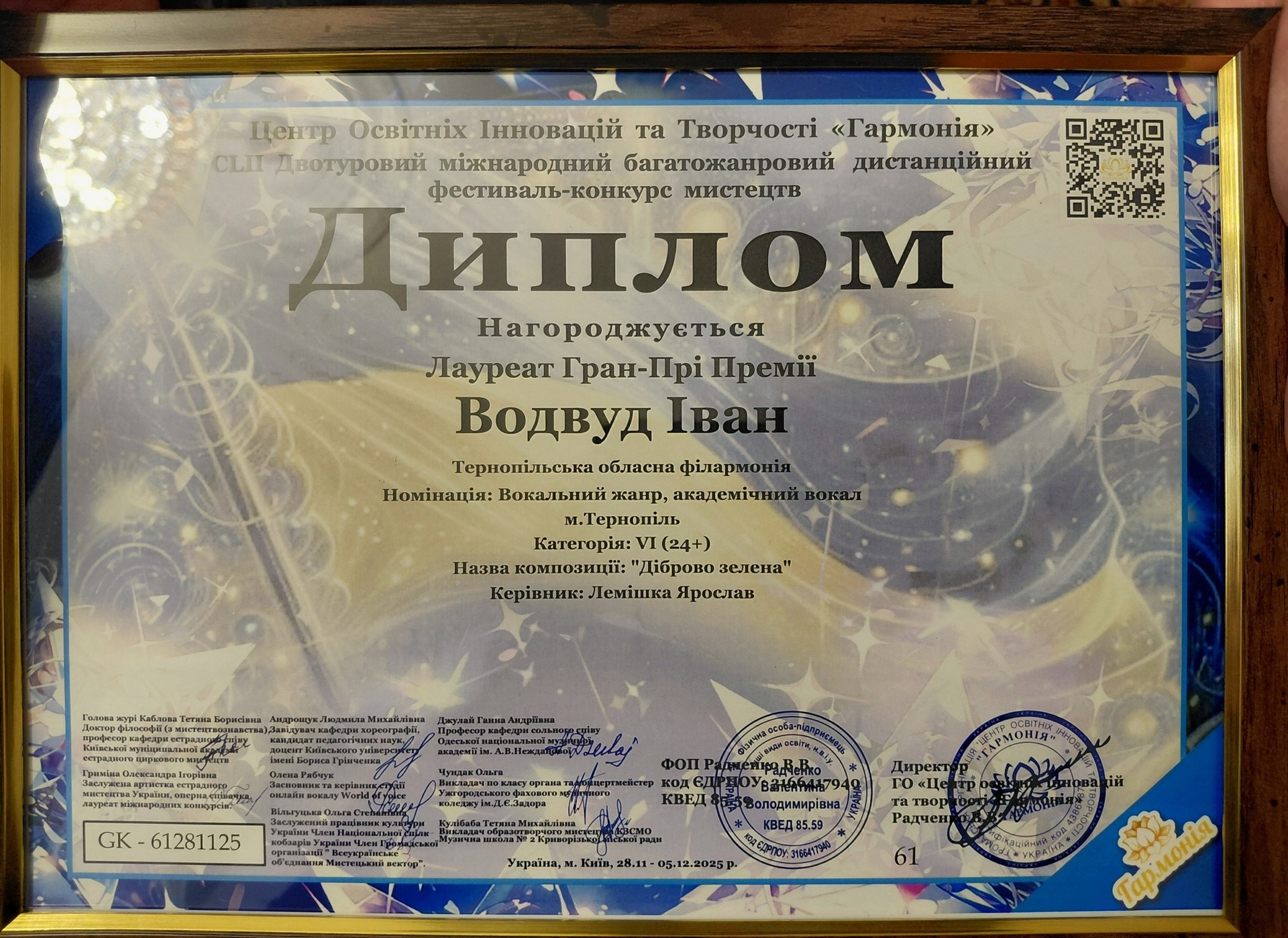 Соліст Тернопільської обласної філармонії Іван Водвуд здобув Гран-прі Премії на Міжнародному багатожанровому фестивалі-конкурсі мистецтв «Гармонія». Про це повідомили у пресслужбі філармонії.