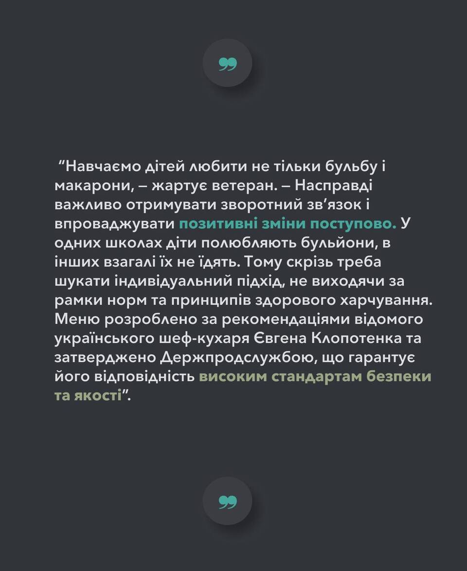 Це не просто щоденне приготування страв, а ціла система, яка впливає на здоров’я та розвиток дітей. Тож це не лише бізнес, а справжня місія і велика відповідальність, — каже ветеран.