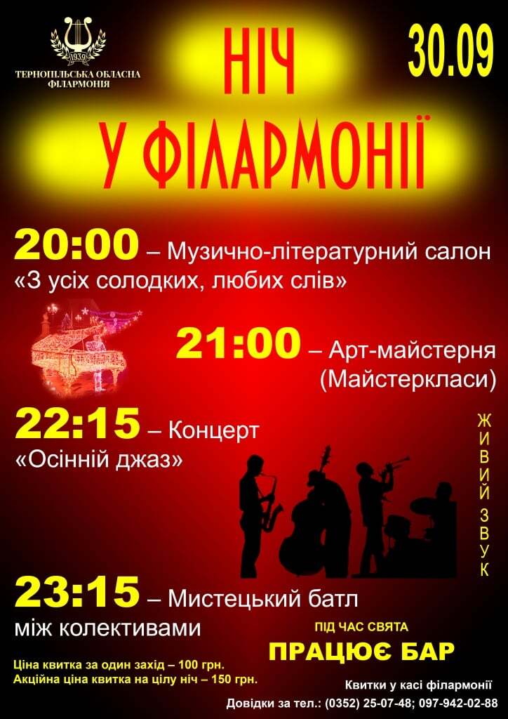 Для відвідувачів «Ночі в філармонії» підготували цікаву мистецьку програму: музично-літературний салон «З усіх солодких, любих слів», арт-майстерня (майстер-класи), концерт «Осінній джаз».