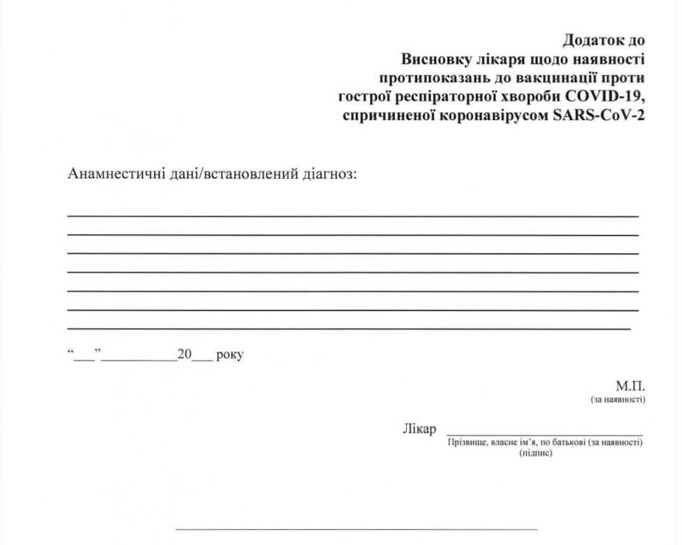 Відповідну форму №028-1/о «Висновок лікаря щодо наявності протипоказань до вакцинації проти гострої респіраторної хвороби COVID-19, спричиненої коронавірусом SARS-CoV-2» та інструкцію щодо її заповнення затверджено наказом МОЗ №2394 від 2 листопада 2021 року. Про це повідомляє пресслужба МОЗ.