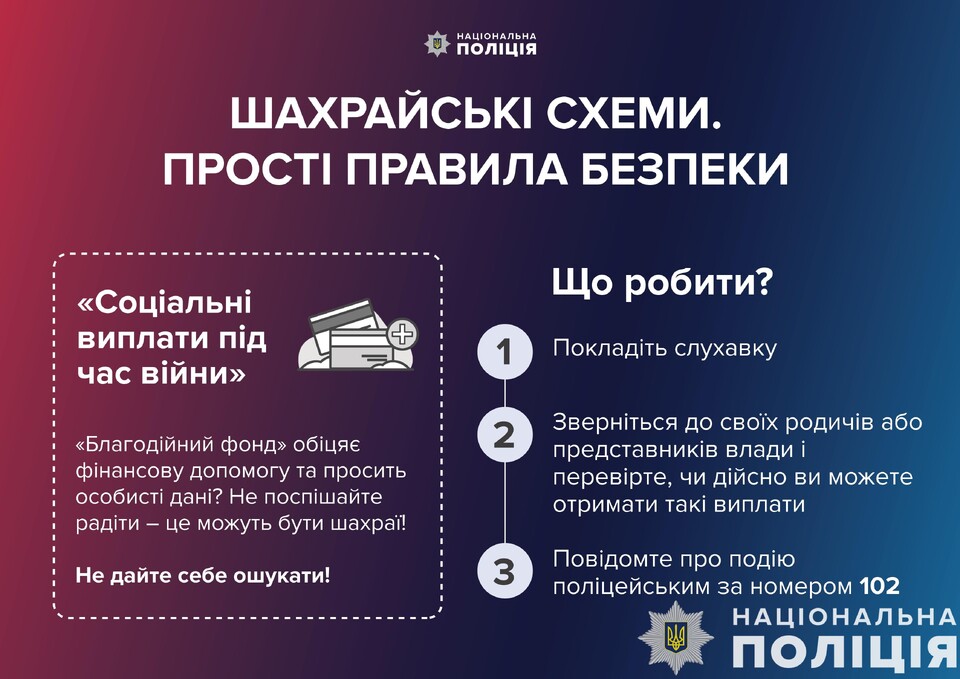 Якщо ви постраждали від шахраїв, не зволікайте та телефонуйте на спецлінію «102». Для оперативного надання допомоги від працівників Департаменту кіберполіції Національної поліції України звертайтесь за номером 0 (800)50-51-70.