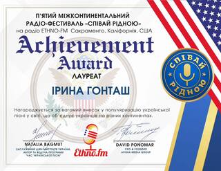 Ірина Гонташ отримала відзнаку Achievement Award - за вагомий внесок у популяризацію української пісні. Фестивальна рада відзначила її старання в поширенні українського культурного продукту на міжконтинентальному рівні.