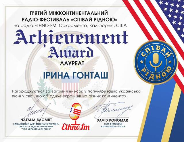 Тернополянка Ірина Гонташ здобула міжнародну нагороду за популяризацію української пісні