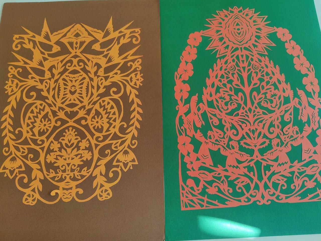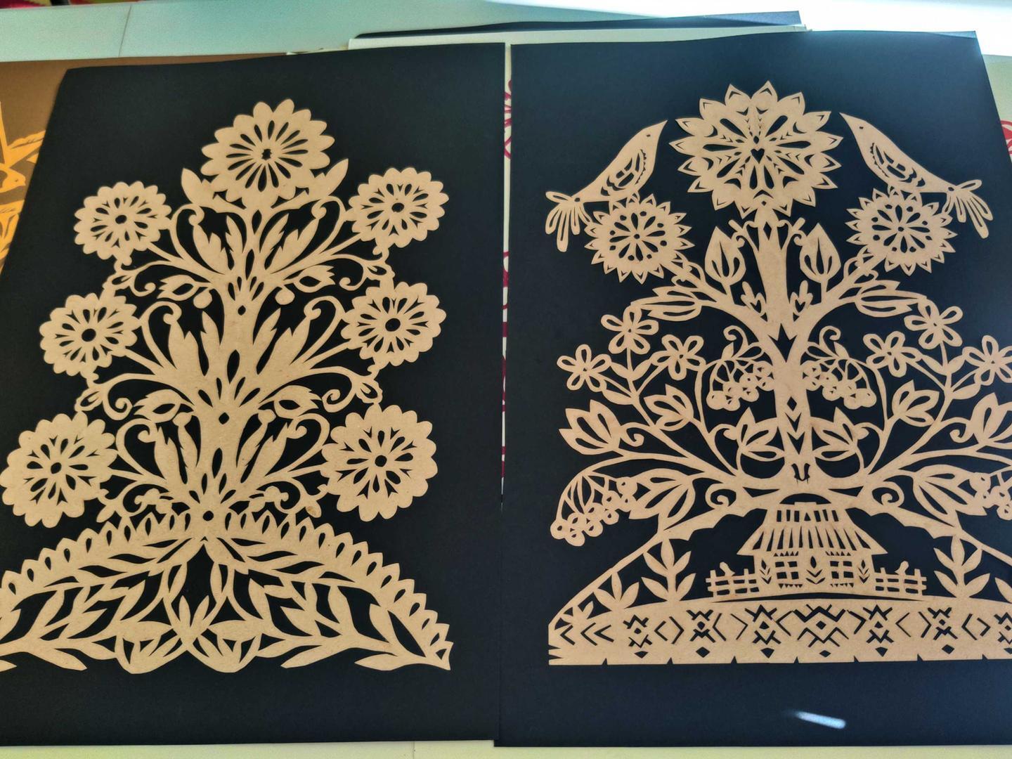 Для виготовлення витинанок пані Галина використовує різноманітні матеріали. Це може бути і звичайний кольоровий папір чи шпалери, еластичний оксамит, подарунковий папір. Проте зараз найбільше їй подобається працювати з крафтовим папером.