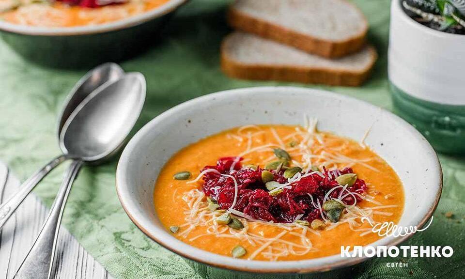 - Розлийте суп по тарілках, посипте сиром та гарбузовим насінням, за бажанням додайте трохи меду й оливкової олії. Суп можна прикрасити натертим бурячком з хроном.