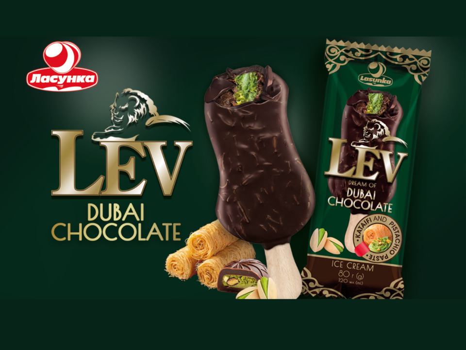 І одним з виробників, хто впровадив цей смак у масове виробництво, стала відома компанія «Ласунка». Нещодавно ТОВ «Ласунка» презентувала новинку – ескімо “LEV” Dream of DUBAI CHOCOLATE!