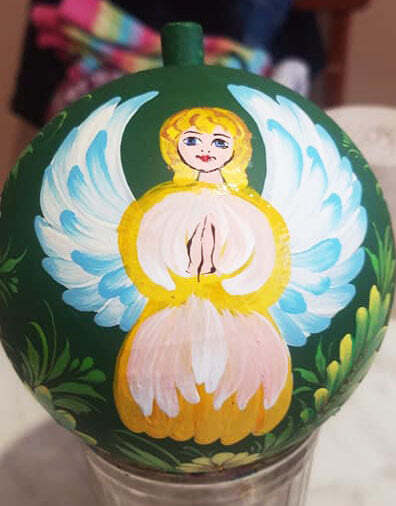Як і решта виробів, новорічні іграшки мисткиня також розмальовує «петриківкою». Всі елементи петриківського орнаменту несуть якийсь символ. Півень символізує пробудження, відродження, зозуля – вічне життя, традиційна петриківська квітка «цибулька» – єдність роду, соняшник – це оберіг домашнього вогнища, ромашки означають здоров’я. Ангел – символ любові і вірності, посланець добра.