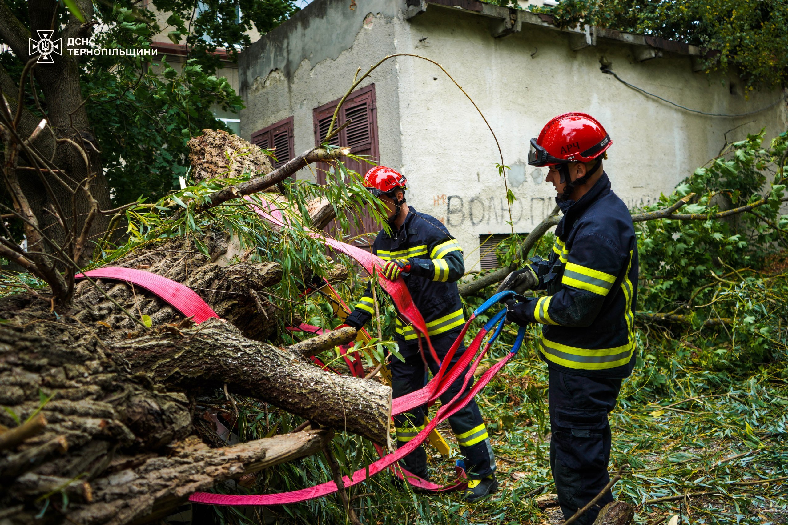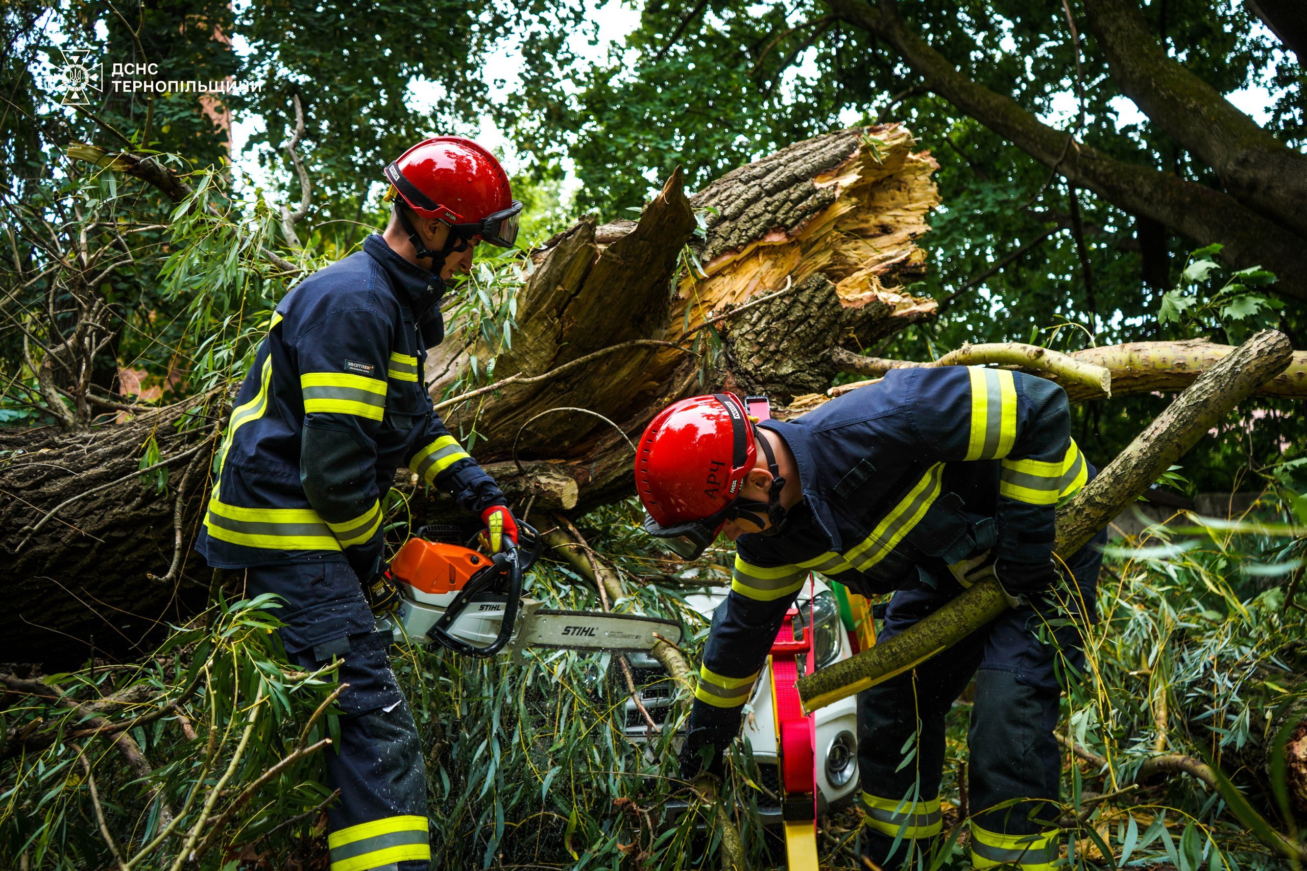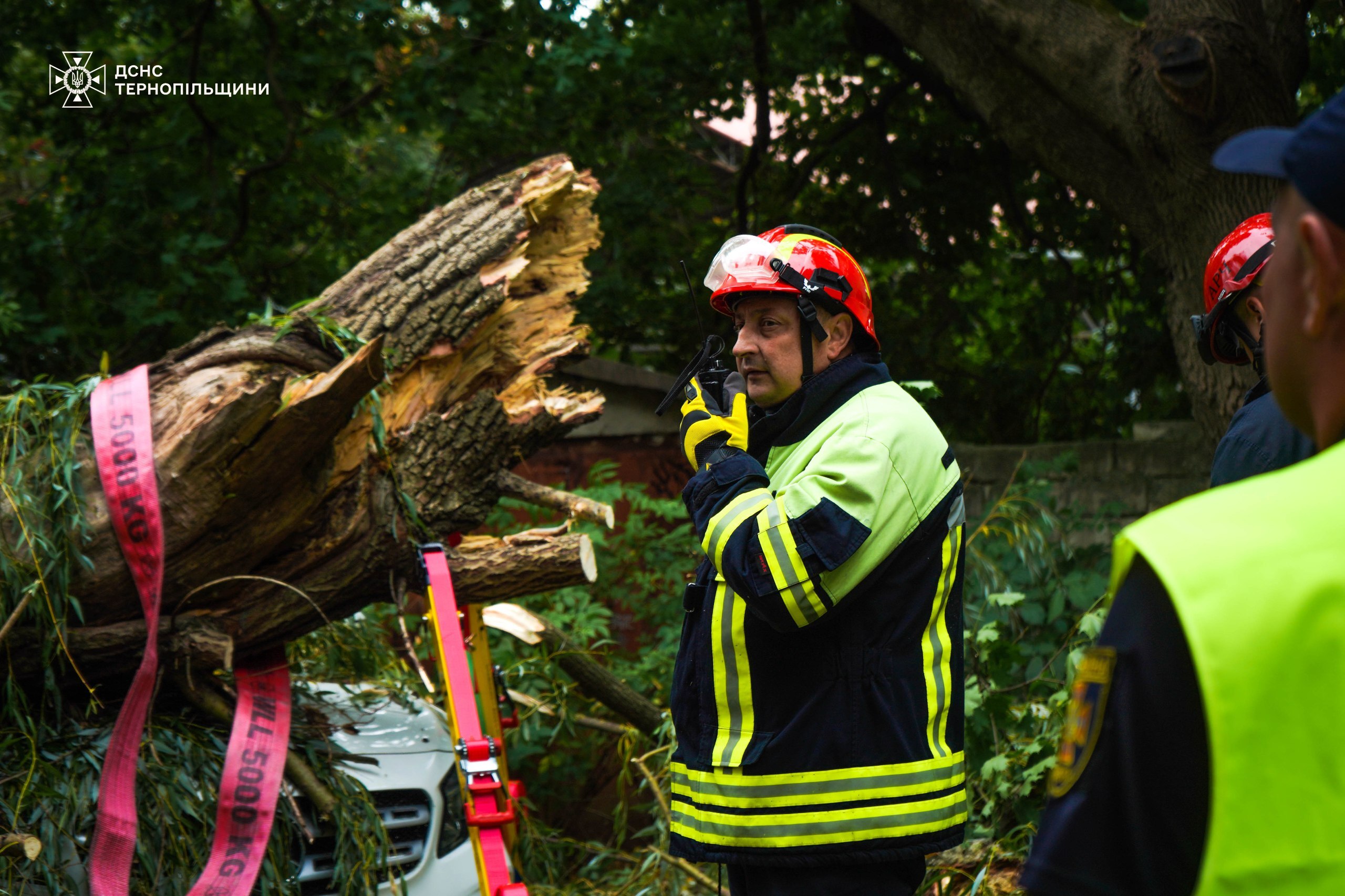 Через сильні пориви вітру дерево впало на припаркований автомобіль в Тернополі на вулиці Руській. Про це повідомили у пресслужбі ДСНС області.