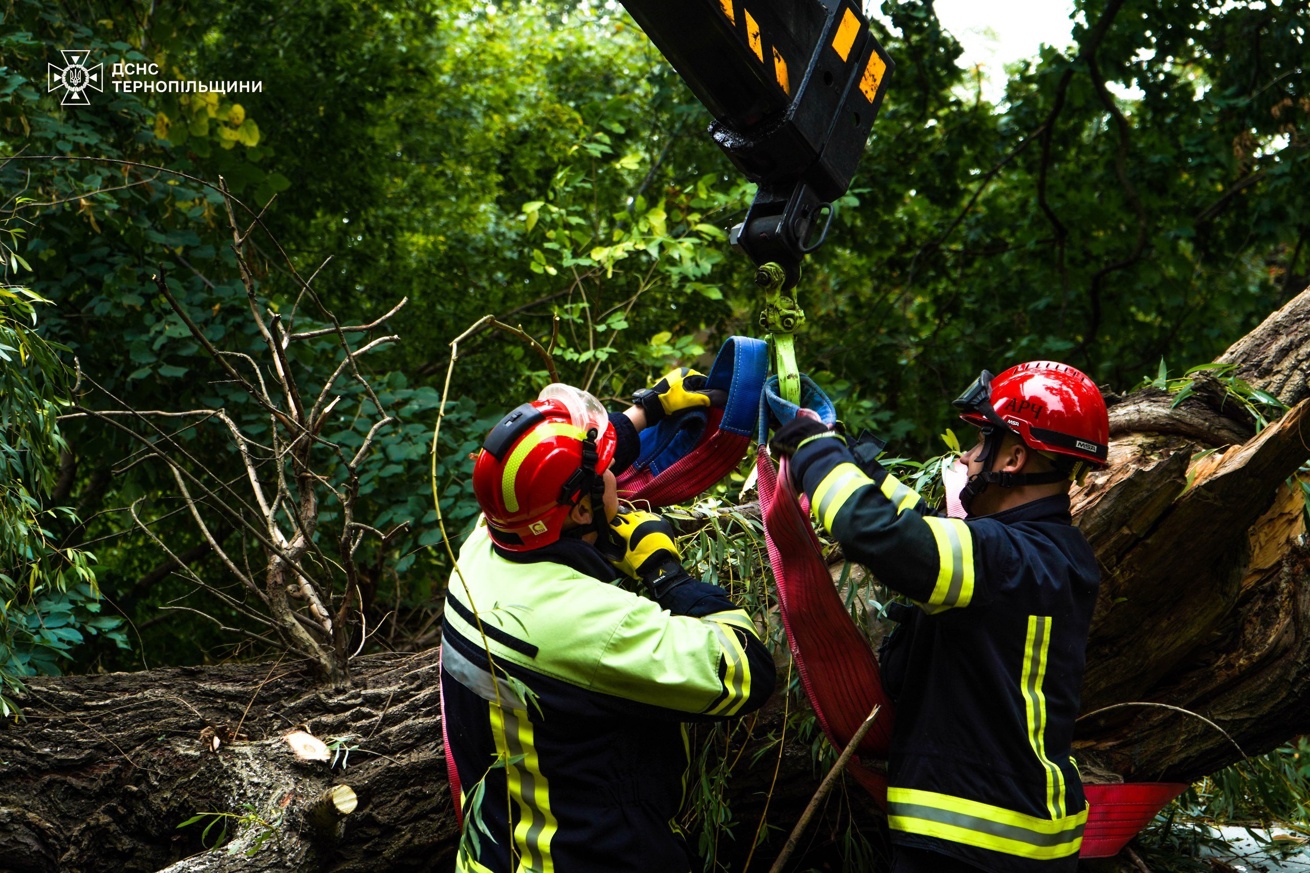 Рятувальники за допомогою спецобладнання розрізали дерево, звільнили авто та розчистили територію. Постраждалих немає.