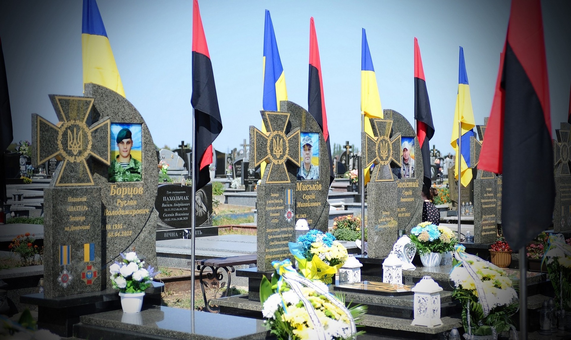 - ліворуч – військовий хрест із тризубом та зазначенням місця останнього бою воїна;