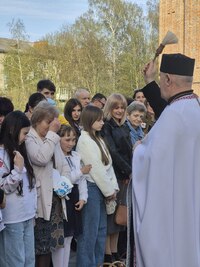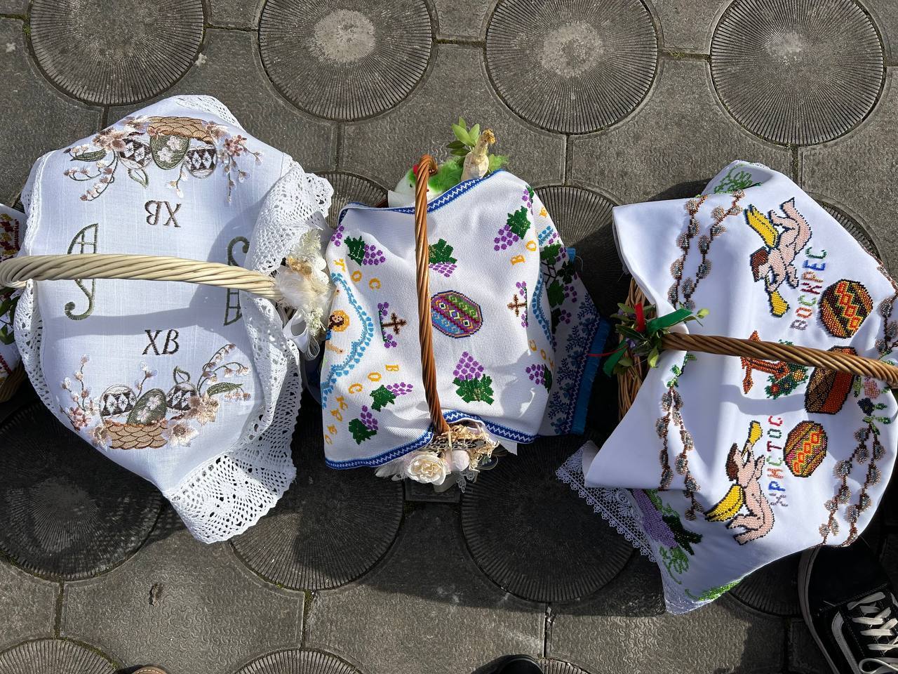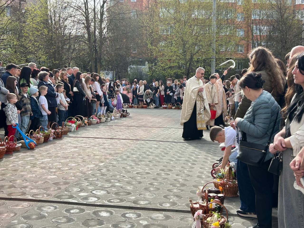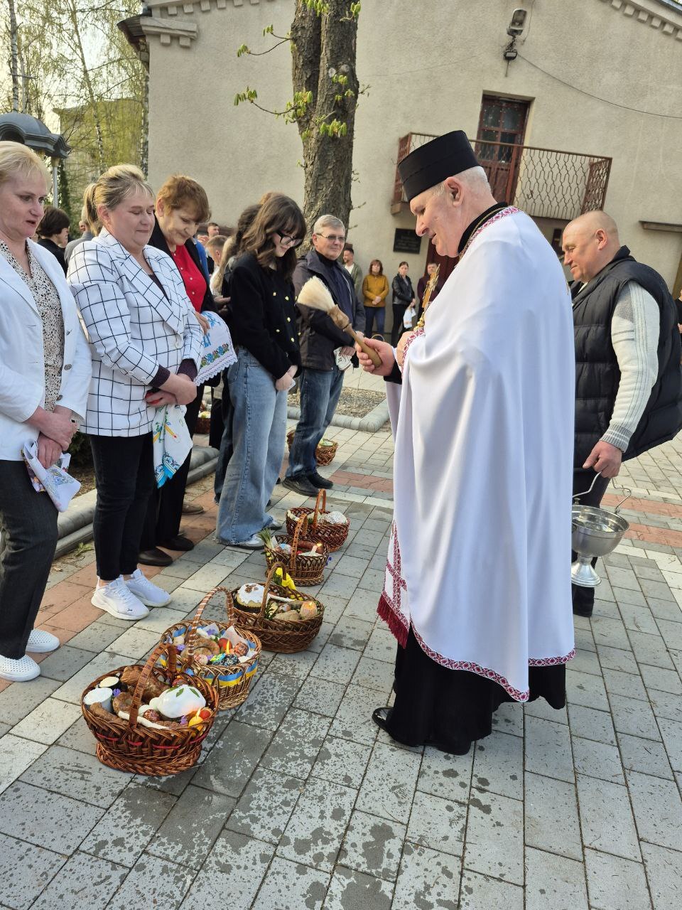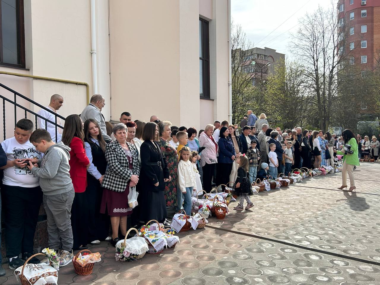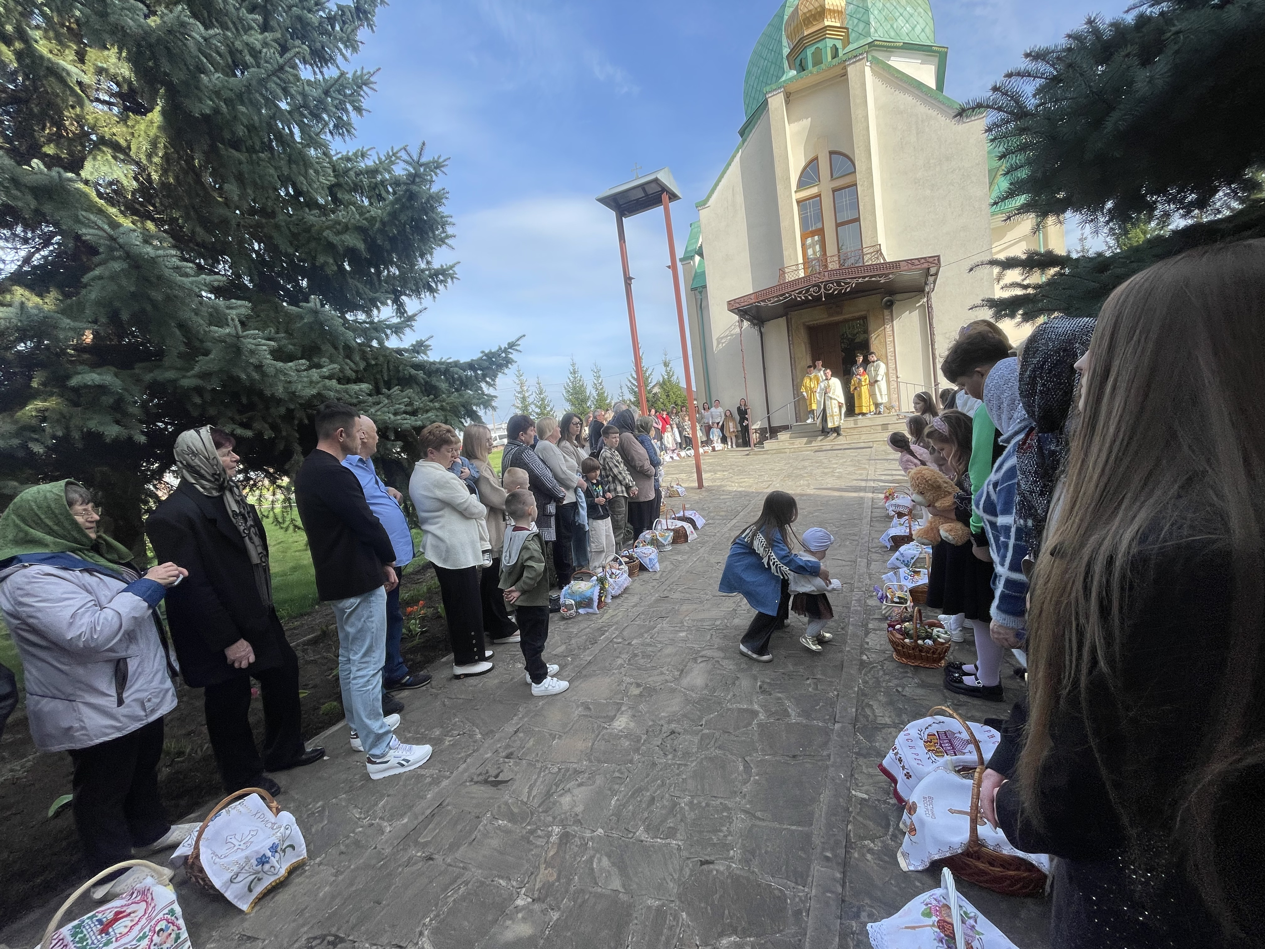 До храмів з кошиками йдуть діти та дорослі, багато хто одягнув вишиванки