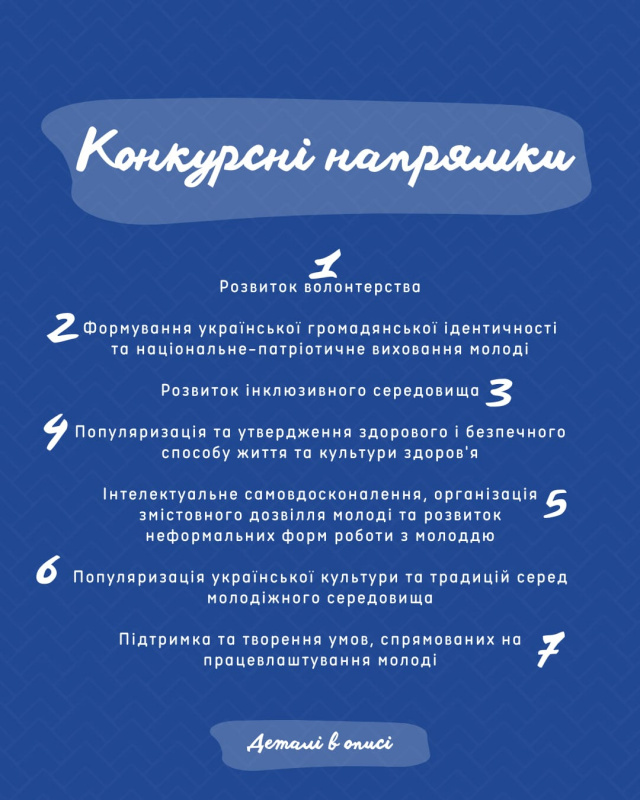 Подані проєкти мають відповідати пріоритетним напрямам, визначеним на 2026 рік. Серед них - розвиток волонтерства як важливої форми самоорганізації молоді Тернопільської громади, формування української громадянської ідентичності та національно-патріотичне виховання, розвиток інклюзивного середовища, популяризація здорового і безпечного способу життя, інтелектуальний розвиток і змістовне дозвілля молоді, утвердження української культури та традицій у молодіжному середовищі, а також підтримка ініціатив, спрямованих на працевлаштування молоді.