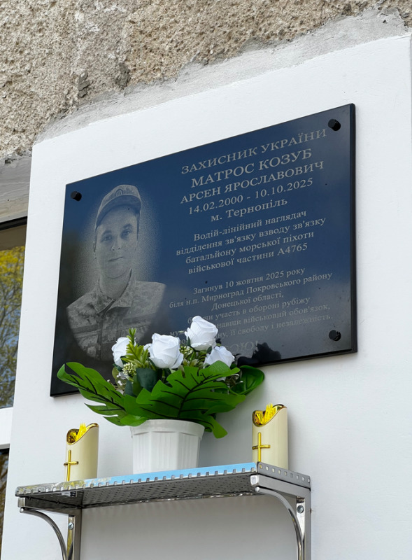 Меморіальну таблицю на честь матроса Арсена Козуба відкрили на фасаді школи №10 у Тернополі. Про це повідомили на сайті міської ради.