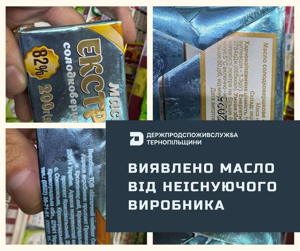 До Головного управління Держпродспоживслужби області звернувся споживач щодо реалізації масла в торгівельному магазині Тернополя від неіснуючого виробника, а саме масла «Екстра солодковершкове 82%» 200 г. Про це повідомили у пресслужбі відомства.