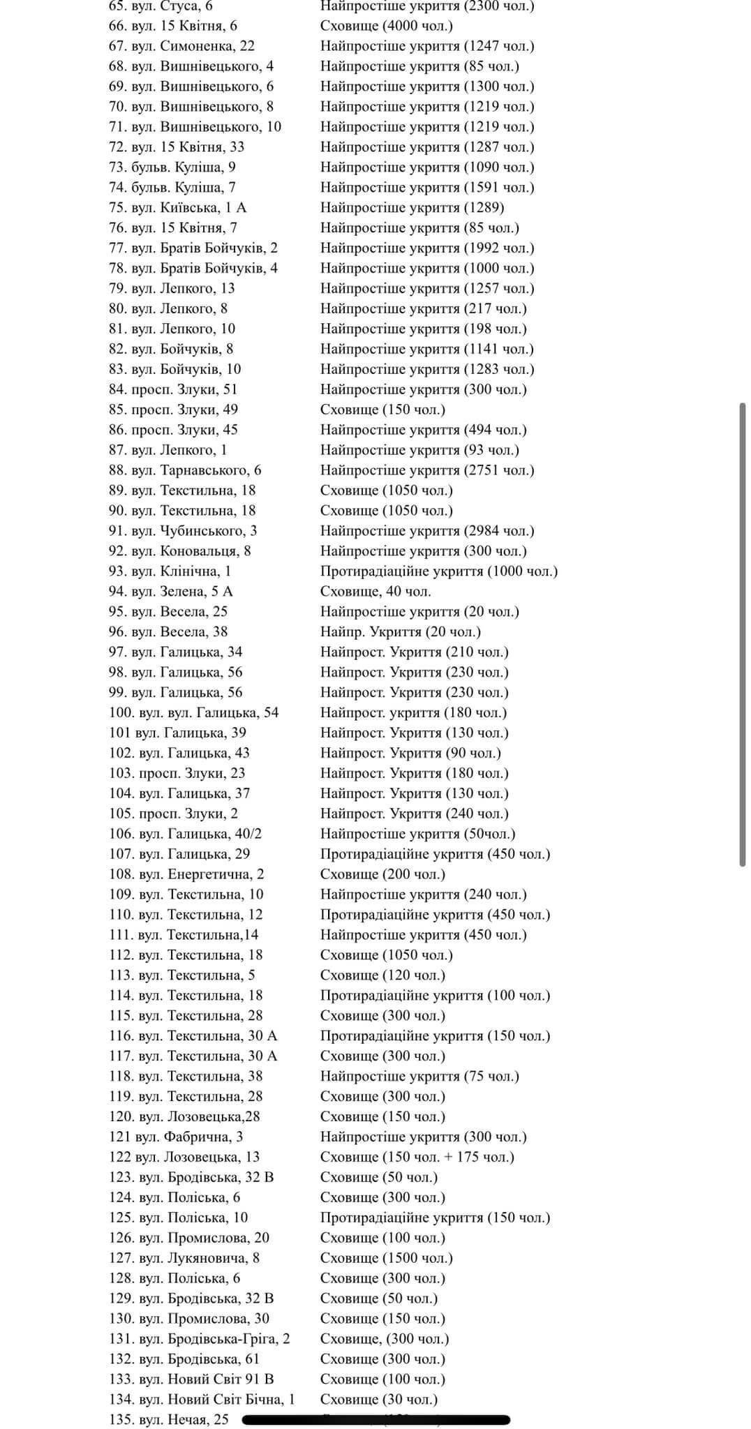 Сховища, які розраховані на більше тисячі людей знаходяться за адресами:
