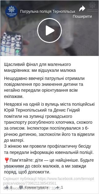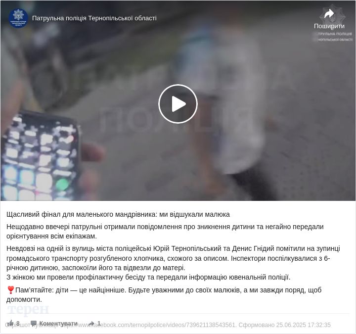 Патрульні отримали інформацію про зникнення 6-річного хлопчика та терміново передали орієнтування всім екіпажам. Незабаром інспектори Юрій Тернопільський та Денис Гнідий помітили на зупинці громадського транспорту розгублену дитину, яка відповідала опису.