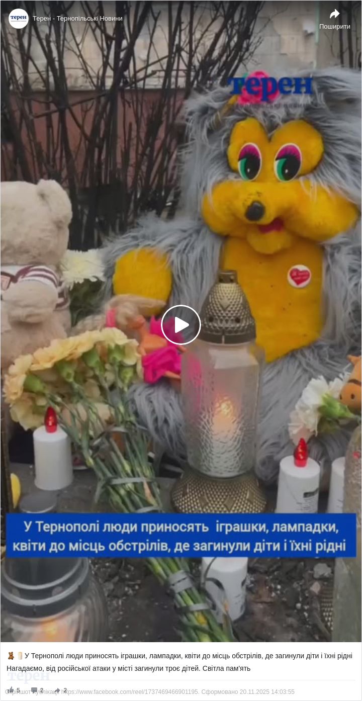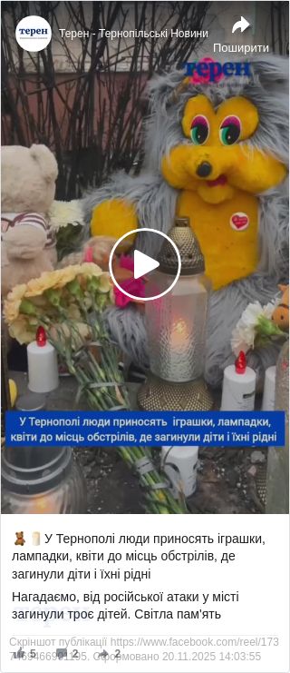Нагадаємо, від російської атаки у Тернополі 19 листопада загинули троє дітей. Світла пам'ять